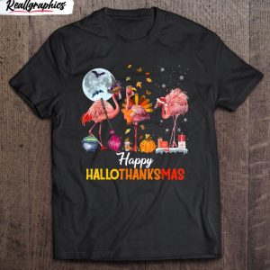 Flamingo Halloween And Merry Christmas Happy Hallothanksmas Shirt