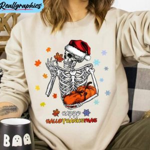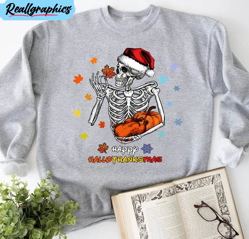 Hallothanksmas Sweatshirt, Halloween Skeleton Merry Christmas Sweater Hoodie