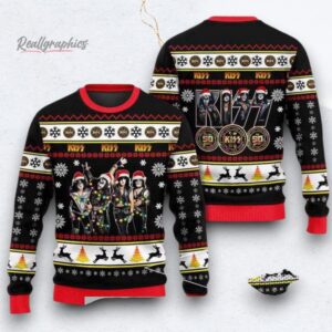 Merry Kissmas For Kiss Band Lovers With Black Reindeer Pattern Ugly Christmas Sweater