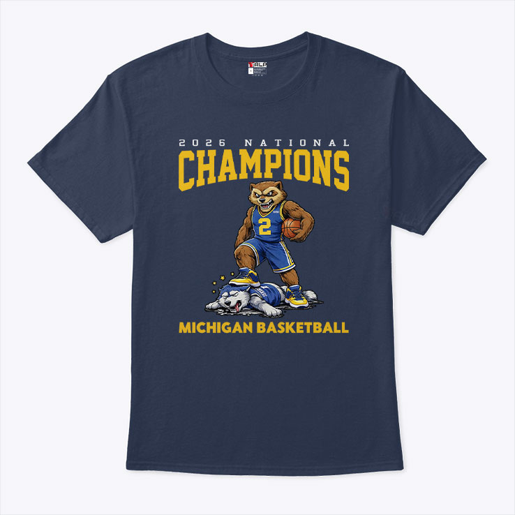 Bright yellow and blue clash vividly across the front of this t-shirt, immediately drawing the eye to the bold varsity block letters spelling out CHAMPIONS. Below, a cartoonish Michigan mascot towers confidently over a defeated opponent, injecting a playful yet fierce energy into the design. The MICHIGAN BASKETBALL subtitle anchors the composition, while the year 2026 NATIONAL and subtle basketball elements weave in a sense of triumph and legacy. Every element here feels deliberate, from the strong typography that echoes collegiate spirit to the balanced layout that places the team’s mascot front and center without overcrowding the graphic. The pairing of intense yellow against deep blue isn’t just about school colors—it evokes the adrenaline and unity of game day, the pride that comes from decades of Michigan basketball tradition. Wearing this shirt signals more than fandom; it’s an embrace of a specific moment, a collective victory that carries into everyday life. It’s a statement for someone who celebrates their team with boldness and heart, whether at a spirited watch party or casual weekend hangout. Friends and family who share that Michigan pride, or anyone who values design rooted in athletic triumph, would instantly recognize the passion behind this graphic. It’s a design alive with culture, competition, and the unspoken bond found only among true supporters of Michigan basketball champions.