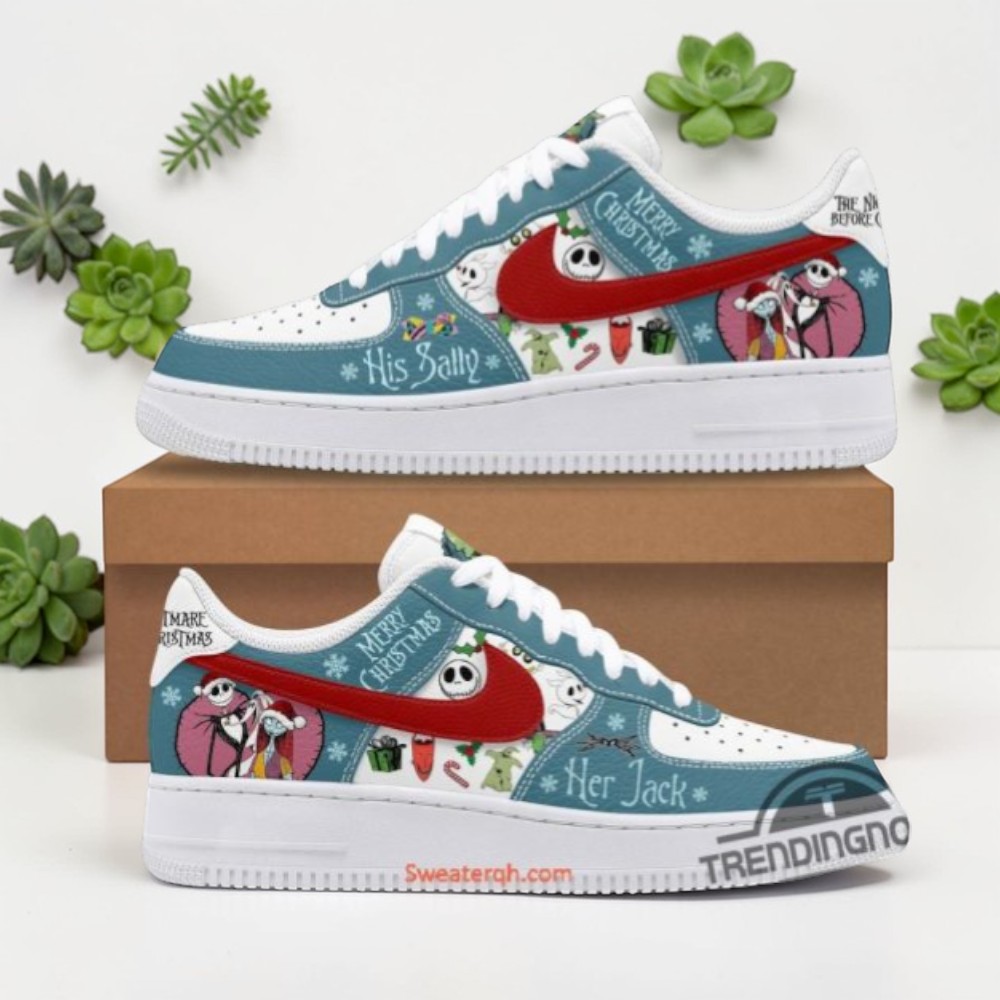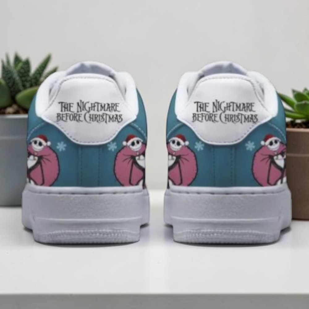 A splash of teal sets the tone, swirling around a crisp white base on these kicks, where shadows of spooky characters from Halloween Town dance across the surface. The laces sit right in the middle, grounded yet ready to tie together the story told by bold, high-contrast illustrations. Jack Skellington’s expressive grin and ghostly silhouettes mingle with festive motifs, crafting a playful yet eerie vibe that flips traditional holiday cheer on its head. These shoes don’t just carry a design; they wear an attitude. They speak to those who live between October and December, who find their joy in the blur of spooky corners and twinkling lights. Perfect for days when you want your footwear to reflect a little more personality, a subtle nod to a world where holiday lines are delightfully blurred. A dedicated fan of The Nightmare Before Christmas or a collector of unique kicks will appreciate the way these sneakers capture the essence of that niche pop-culture blend — edgy, festive, and unapologetically individual. More than something tossed on for function, this Spooky Christmas Air Force 1 offers a way to carry a favorite story off-screen, woven into everyday moments. Whether they end up paired with a casual outfit or part of a thoughtful gift exchange, these sneakers hold room for self-expression in every step, quietly celebrating the joy of being a bit different during the holidays.