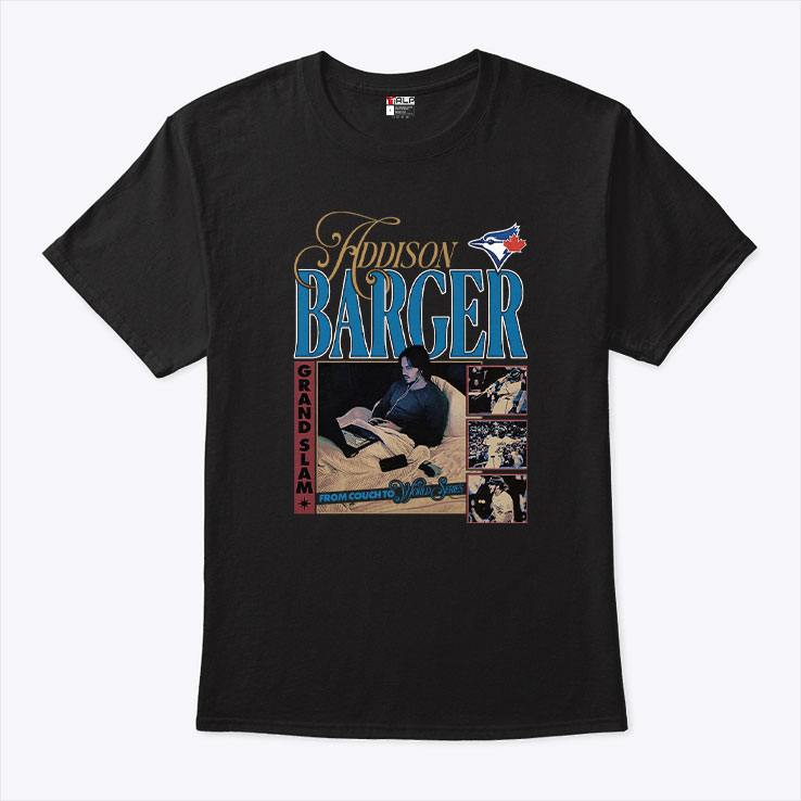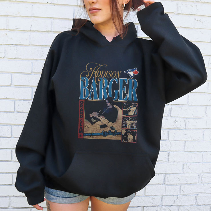 There’s an unmistakable energy in vintage sports posters, the kind that brings to mind old-school ballparks and the crack of the bat under a summer sky. This shirt captures that vibe with a bold graphic collage that feels like a page torn from a retro comic book. The name Addison Barger stands out in large, serif type, shaded with a cool blue gradient that contrasts sharply against the busy mix of action-packed photos and classic sports motifs. Small details, like a subtle Toronto Blue Jays flag, anchor the design in a specific fandom without overwhelming the composition. Each panel on the shirt tells its own story, capturing moments of athleticism and celebration that resonate with anyone who follows the intensity of the game. It’s not just about wearing team colors—it’s about carrying a carefully layered homage to a player who stands out. The slightly chaotic yet well-balanced layout draws the eye across the shirt naturally, inviting a closer look at the snapshots and typography working together. This kind of design finds its place well beyond the stadium. It suits someone who appreciates the narrative of sports history, whether worn casually on weekends, layered under a jacket for a coffee run, or draped over a chair while flipping through a baseball card collection. For fans of Addison Barger and lovers of graphic storytelling in sports, it offers a quiet yet spirited way to show that connection in everyday moments.Addison Barger Grand Slam Unisex Shirt