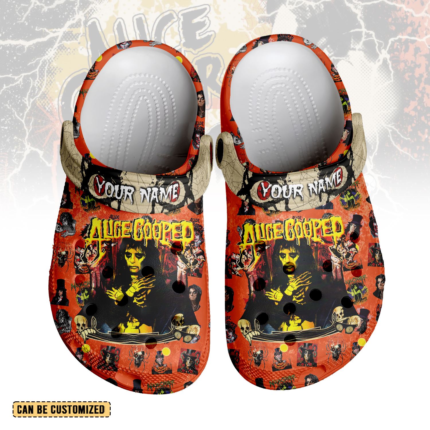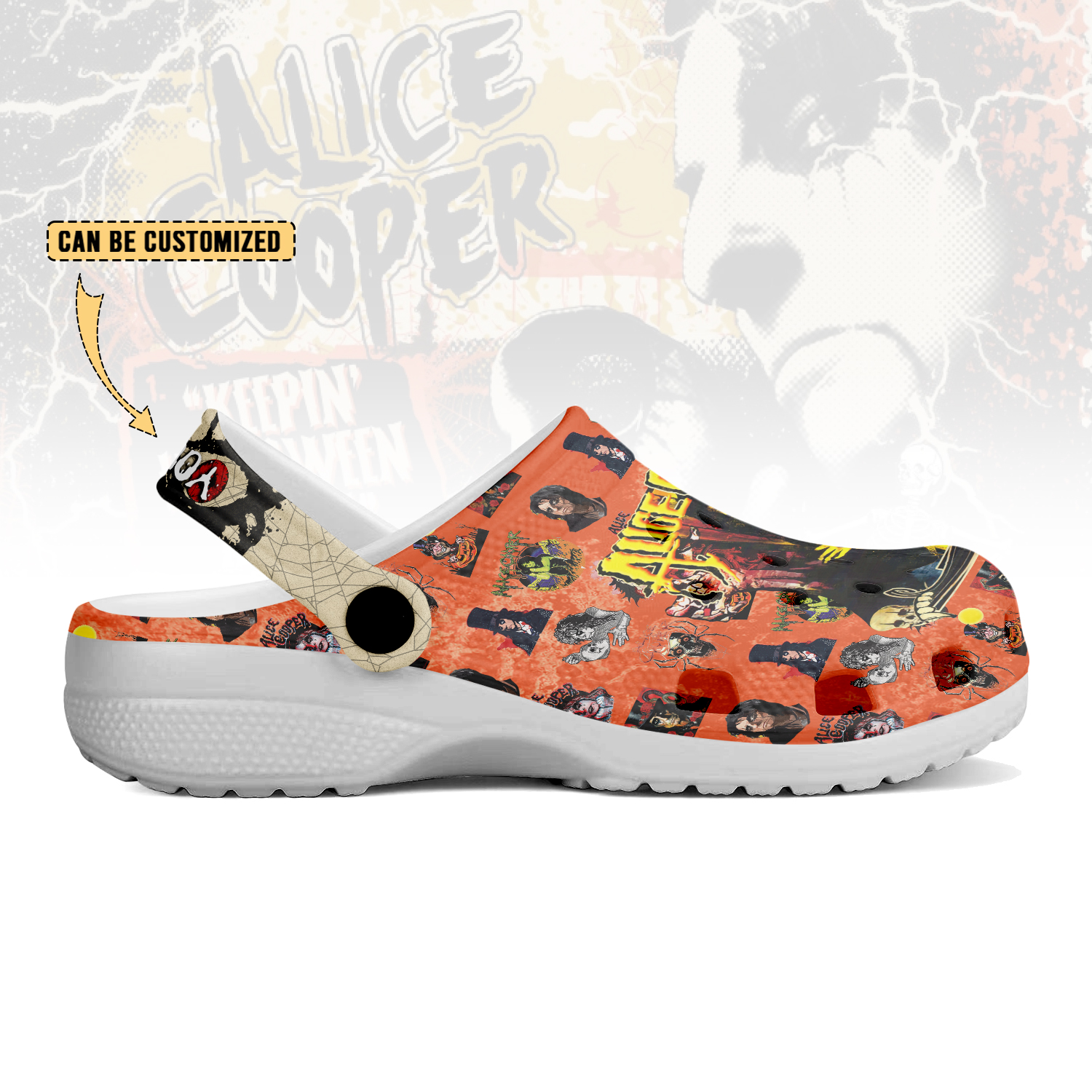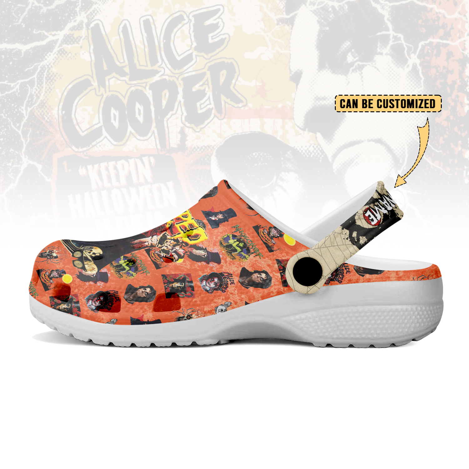 These Alice Cooper clog-style slip-ons are packed with bold, horror-rock visuals on a fiery orange base, featuring a standout ALICE COOPER front graphic and an all-over collage of classic icon-style details. The strap is customizable with your name, so your pair feels one-of-a-kind—perfect for collectors, concert nights, or everyday wear with attitude.