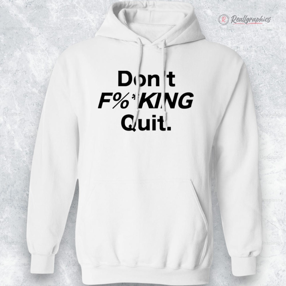 The sharp, unapologetic energy of a street anthem vibrates through the design, reminding you of that raw pulse when determination edges into defiance. Black text slashes across crisp white fabric, each letter varying in size and weight, creating a chaotic rhythm that’s impossible to ignore. The overlay effect partially obscures and intersects the bold sans-serif typography, as if the message itself is battling to break free—disruptive, confrontational, relentless. This hoodie speaks to those who recognize hustle as both a mindset and an act of rebellion—a rebellious motivation that thrums beneath the surface of daily grind culture. It’s tailored for young adults and casual wear enthusiasts who aren’t content with subtlety, who wear their resolve like armor, whether navigating the weight room or making a statement during laid-back hangouts. The monochrome palette keeps it stark, while the fight in the lettering invites a second glance. Wearing this hoodie feels like choosing a silent but firm declaration: no hesitation, no escape, no quitting. It suits anyone who thrives on pushing boundaries, someone who appreciates that grit is as much about attitude as action. Beyond personal wear, it surfaces as a fitting gift for teammates or friends who embrace struggle and grind with equal parts fire and ferocity. The Dont F_cking Quit Hoodie carries more than a blunt message—it carries the nuance of unstoppable spirit rendered in design.