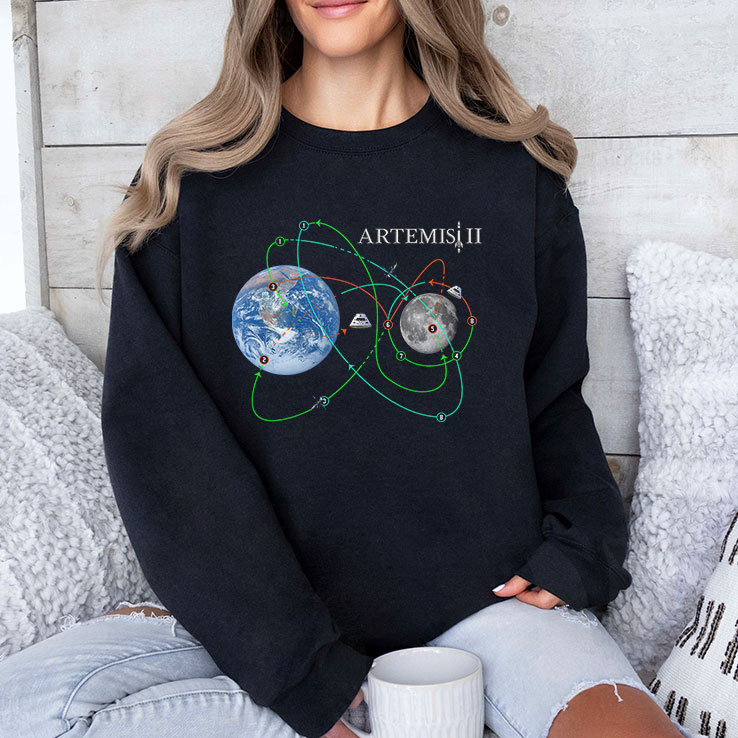 There’s something quietly magnetic about a t-shirt that captures a moment in human curiosity—this one does just that. At first glance, the design draws you in with a detailed but clean depiction of the Earth and Moon, connected by sweeping orbital paths and dotted with spacecraft icons that feel like pauses in a cosmic journey. The white “NASA Artemis II” text stands out sharply against the darker background, styled in a serif font that nods to both tradition and forward motion. The graphic balances technical precision with a kind of futuristic minimalism, with labeled nodes that hint at the stages of this ambitious mission. It’s a design that invites more than one look—whether you’re a casual fan of space exploration or someone who follows the Artemis program closely, you’ll find details worth appreciating. The subtle interplay of diagrams and text gives the shirt an educational edge without feeling like a textbook. Wearing something like this says something about who you are—a person curious about the cosmos, someone quietly proud of how far we’ve come and excited for where we might go next. It fits naturally into the life of anyone who attends astronomy meets, space-themed gatherings, or simply enjoys sharing their passion with friends. The Artemis II NASA space shirt works equally well as a thoughtful gift for students diving into science or collectors who enjoy celebrating milestones in space history. It’s less about making a statement and more about wearing a shared enthusiasm with ease.Artemis II Moon Mission NASA Space Program Fan Shirt