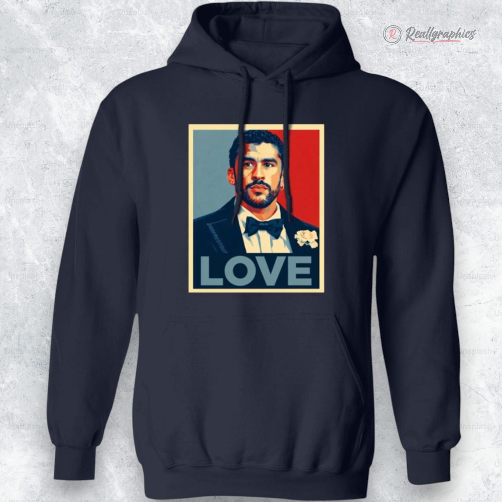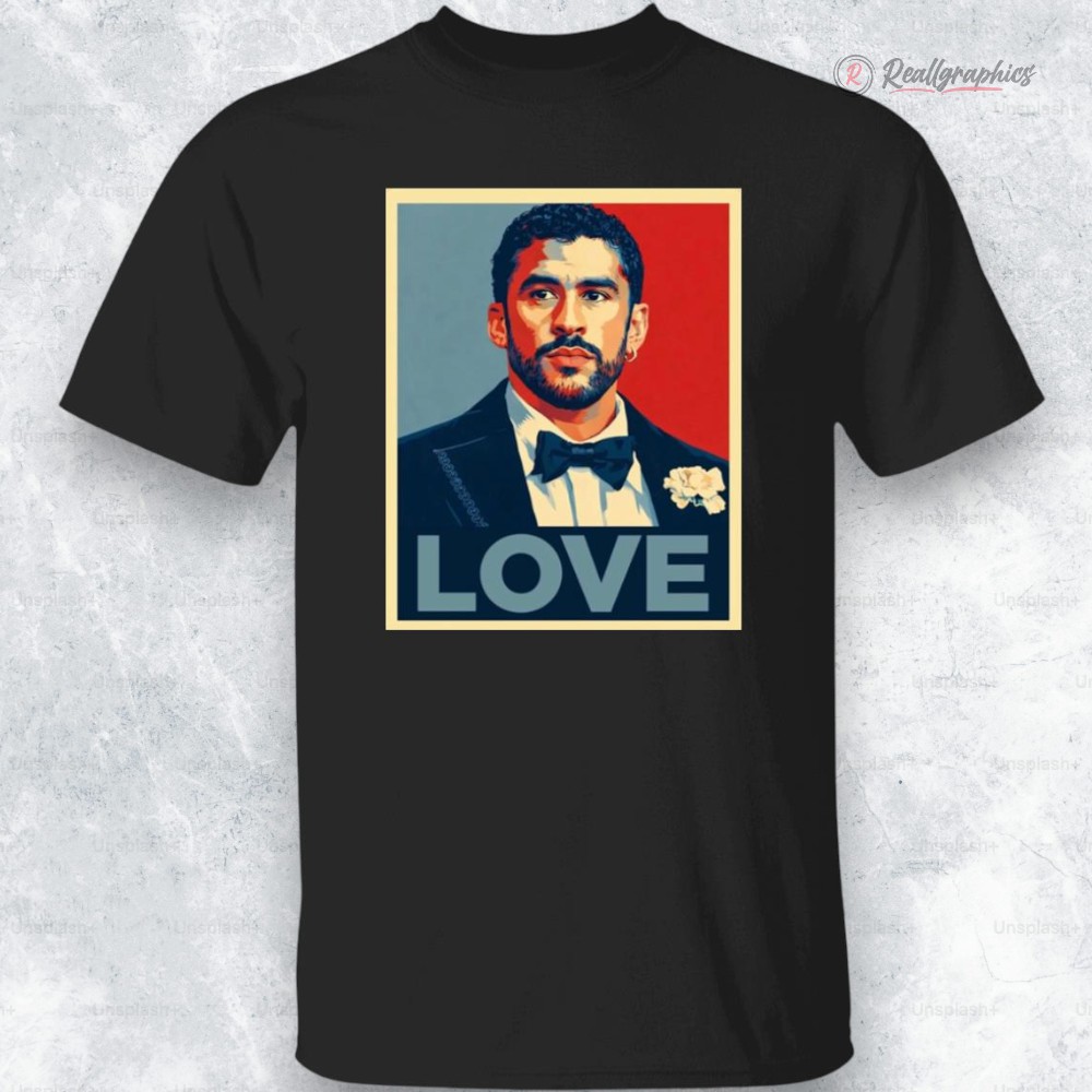 A portrait of a man in a sharp tuxedo, framed inside blocks of red, blue, and beige, commands attention on the front of this hoodie. Underneath, the word LOVE stretches boldly in all caps, its clean sans-serif font echoing the confidence captured in the image above. The design feels like a nod to both old-school cinema and edgy streetwear, layered with an unmistakable pop art flair that’s unapologetically vibrant. Wearing something like this speaks to more than just fashion sense—it’s a statement about embracing a unique identity. It’s for those who want their clothes to mirror both style and substance, blending retro inspiration with a modern edge. Young adults who gravitate toward graphic tees and street culture will find this particularly resonant, a canvas for expressing affinity for music, artistry, and self-assurance without saying a word. This isn't simply a hoodie; it’s a symbol of confidence in being unapologetically yourself. It works on a casual day out or even on a date night when you want to hint at a romantic side wrapped in bold visual storytelling. Someone who admires pop art’s powerful simplicity or borrows from cinema’s iconic aesthetic would naturally appreciate the layers of meaning stitched into this design. The bad bunny love shirt carries a vibrancy that feels personal, a creative pulse that goes beyond the ordinary.Bad Bunny Love Shirt