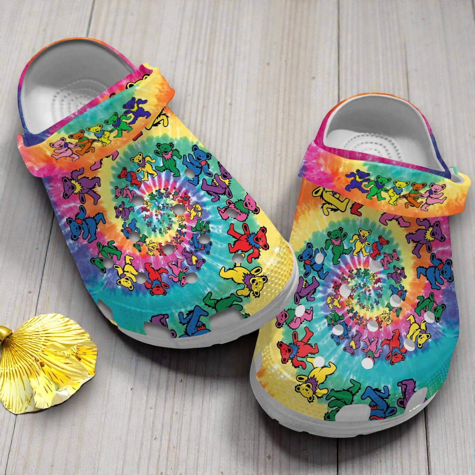 Step into the groove with these colorful Dancing Bear clogs. The design features a bright, rainbow tie-dye spiral background covered in the iconic marching bears. It is a fun, psychedelic look that fits perfectly at a music festival, a concert, or just lounging around the house.