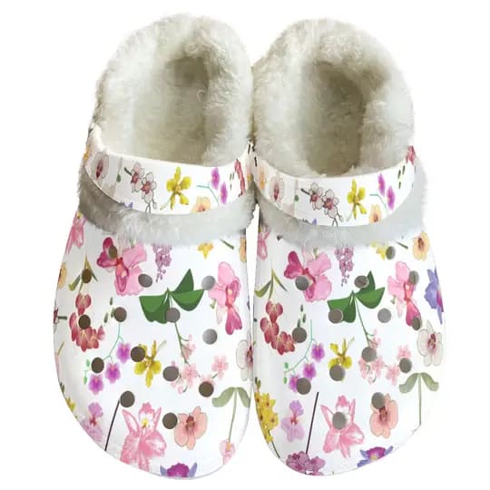 These floral fleece-lined clogs bring a clean white base with a soft pastel flower print that feels fresh and feminine—then finish it off with a plush sherpa-style lining that keeps your feet warm on colder days. They’re easy to slip on for quick errands, school drop-offs, or just padding around the house when you want comfort without heavy boots.