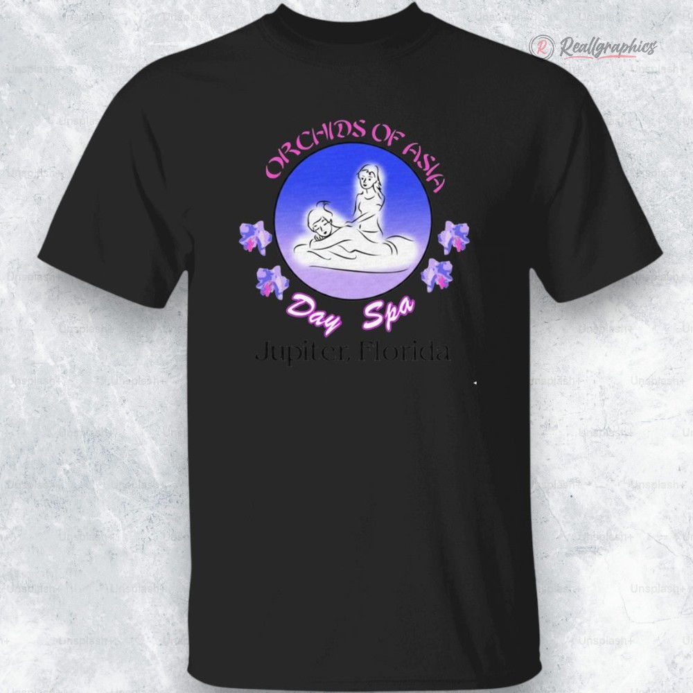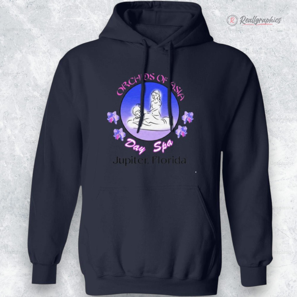 The playful blend of retro neon hues and delicate orchids creates a striking visual that immediately grabs attention. A circle logo anchors the design, with a purple gradient that fades softly into the background, setting a relaxed, tropical tone. Silhouettes weave through the layout, adding a subtle sense of movement without overwhelming the eye. The typography curves gently around the edges in a decorative serif, casting the words Orchids of Asia Day Spa Jupiter Florida in cheerful pink and purple shades that feel both feminine and vibrant. This hoodie speaks to a laid-back yet spirited personality—someone who appreciates local culture and the quiet luxury of a spa day but wears that appreciation on their sleeve, literally. The design carries a touch of nostalgia through its retro vibes but keeps it modern with fresh color contrasts and thoughtful placement. It’s the kind of piece that feels at home hanging out with friends after a casual day out or tucked into a weekend itinerary that includes a stop at the spa itself. Locals who know Jupiter, Florida, and visitors who want a tangible memory from their trip would both find something genuine here. It’s more than merch; it’s a small expression of relaxation and style that fits into everyday moments without trying too hard. Whether worn around town or paired with your favorite jeans for a weekend coffee run, this hoodie effortlessly blends comfort with a bright nod to a unique place and experience.