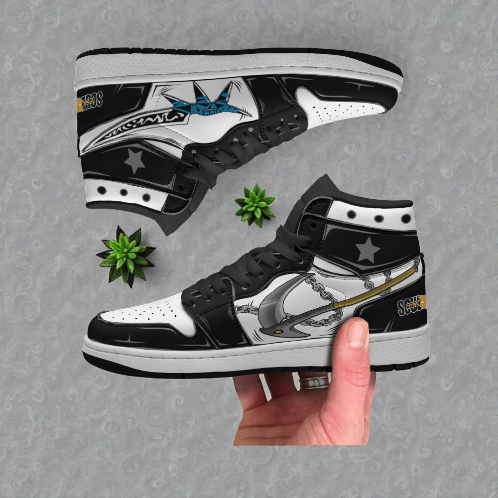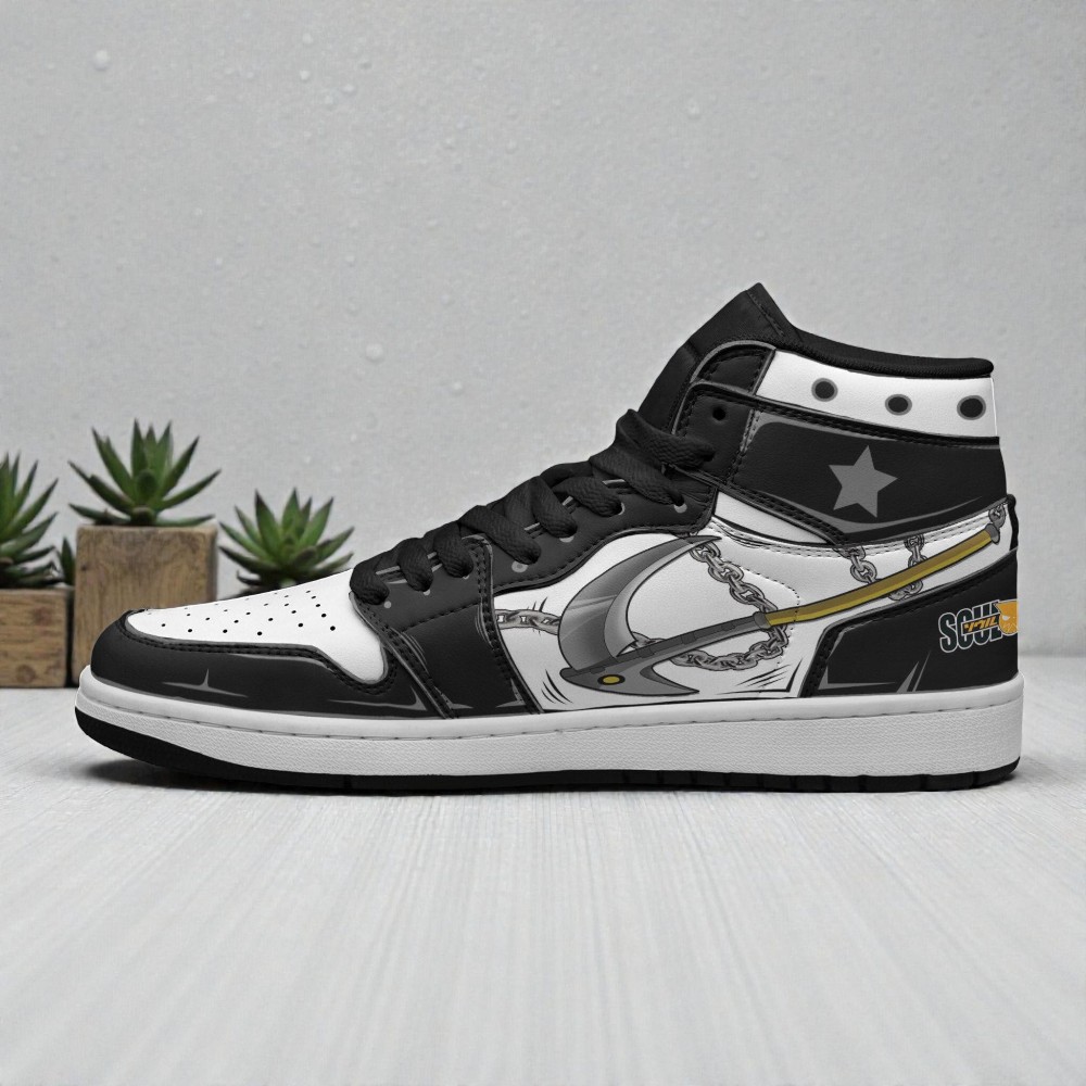 The design is inspired by the manga's gritty black and white art style. The top shoe features Black Star's partner Tsubaki in her Enchanted Sword mode, while the bottom shoe is loaded up with chains and weapon imagery fit for any Meister. You'll also spot the Star clan logo on the heel and the Soul Eater title tucked near the back.