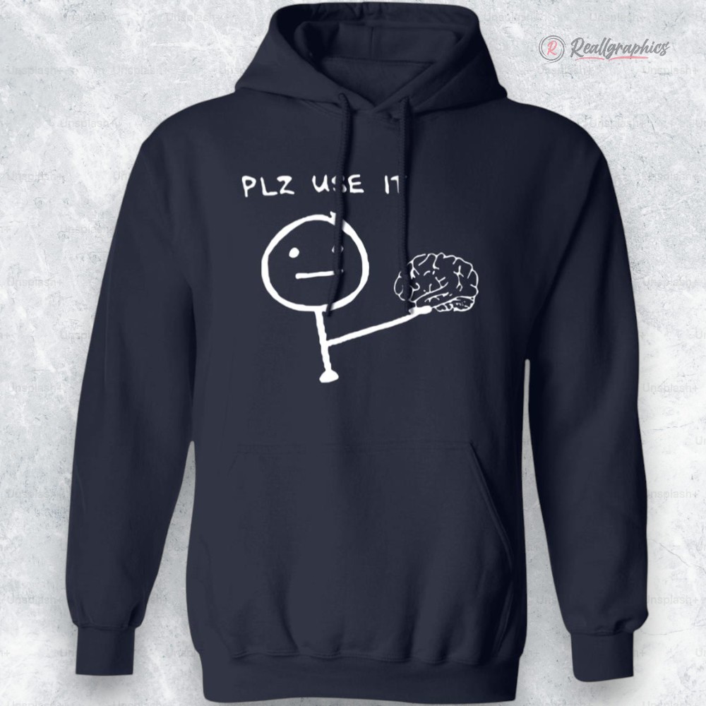 There’s something instantly eye-catching about the way the sketchy stick figure clutches a brain, paired with the handwritten plea, “PLZ USE IT.” The minimalist lines are anything but dull—they capture a specific wit that feels effortlessly clever, as if mocking the quiet frustration of those moments when common sense seems like a rare commodity. The simplicity of the black-and-white palette keeps the message clear and unpretentious, letting the humor land without distraction. This design taps into a particular kind of humor that resonates with anyone who appreciates memes but prefers a more understated, hand-drawn vibe over loud graphics. It’s the kind of piece that speaks to the quick thinkers, the dry joke lovers, the students pulling long nights with a dose of self-aware sarcasm. The brain meme hoodie becomes less about fashion and more about identity: a lighthearted nod to intellect and the everyday battles of using it well. Ideal for casual lounging, late-night study sessions, or just kicking back around friends who get the joke, this hoodie fits snugly into a laid-back lifestyle. It’s also the kind of gift that feels personal without being over the top—something for classmates or roommates who thrive on witty banter and a little bit of cheeky encouragement from their clothing. For anyone who loves to wear humor like a badge of honor, the brain meme hoodie speaks volumes.
