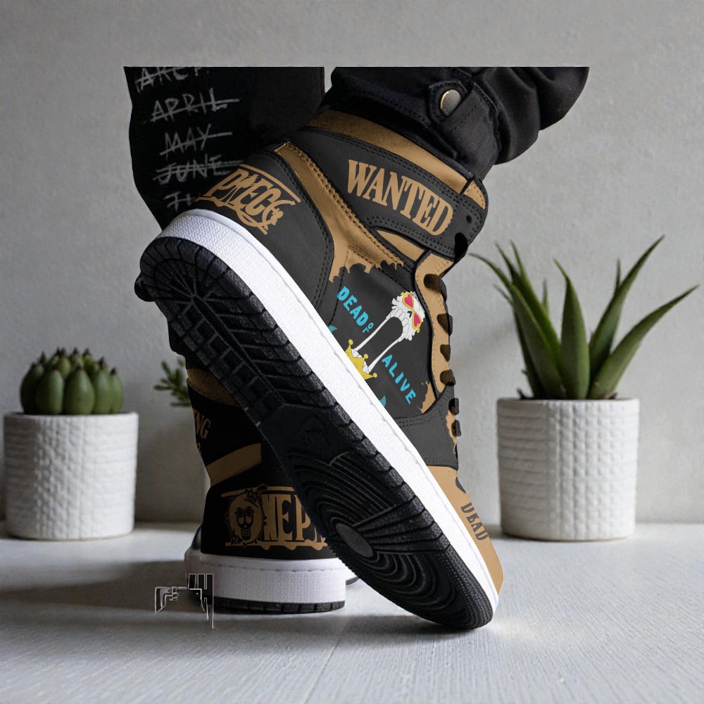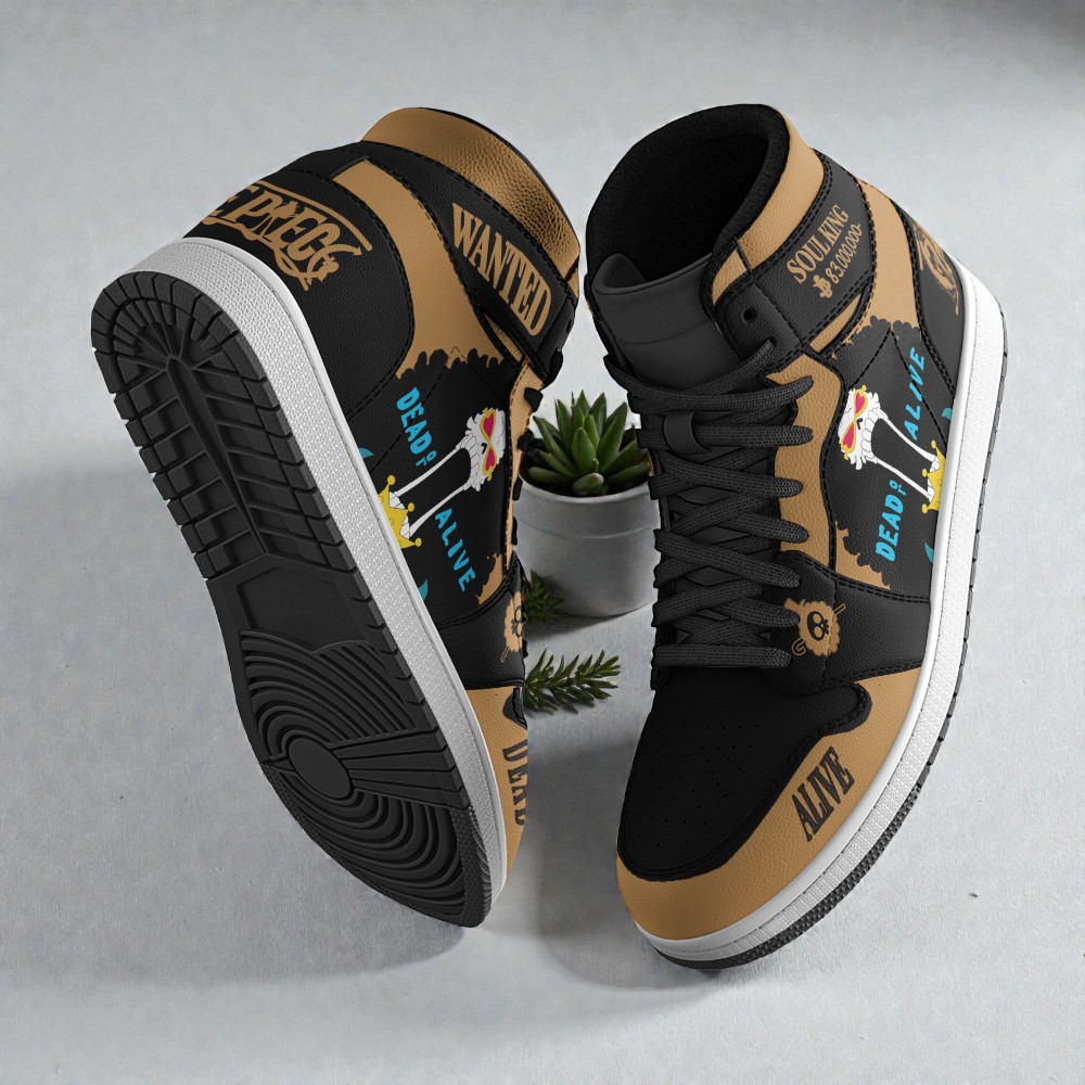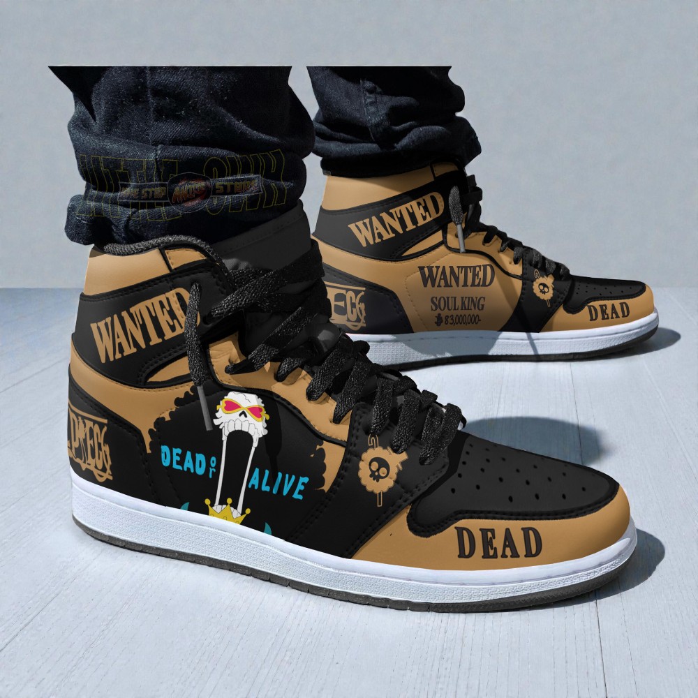 The design mimics the classic Marine wanted poster texture, using a beige and black colorway that looks just like aged parchment. On the side panel, you’ve got Brook’s signature skull portrait with the "Dead or Alive" text and his bounty details clearly visible. We also stamped "WANTED" on the ankle collar and put "DEAD" right across the toe box for that extra bit of flair.