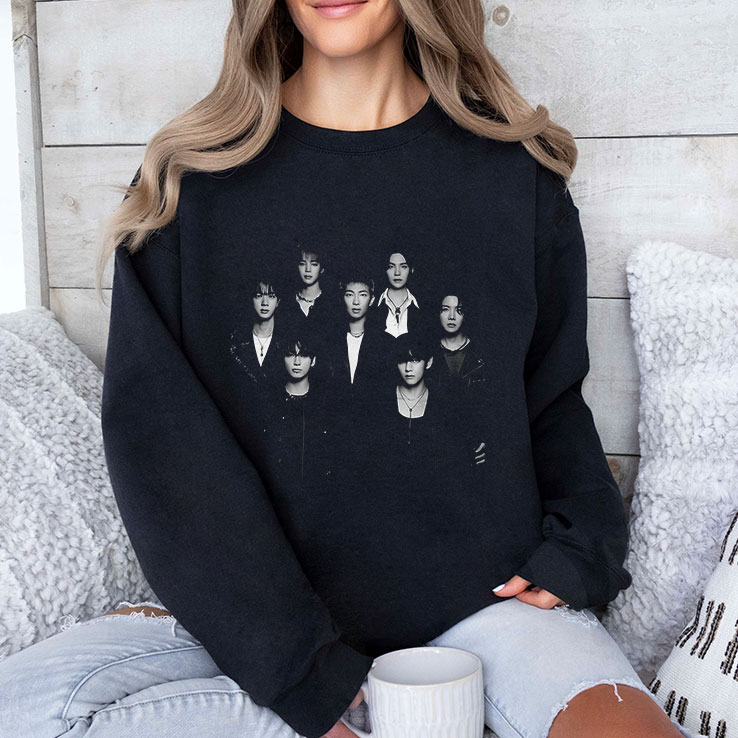 There’s something quietly powerful about wearing a band shirt that doesn’t scream for attention but still carries a strong sense of identity. This particular BTS shirt captures that essence perfectly. Its black fabric creates a sleek canvas, while the grayscale group photo of the Bangtan Boys adds a subtle, yet unmistakable nod to the band’s iconic energy without overwhelming the eye. The minimalist monochrome design balances coolness with a refined edge, making it approachable for everyday wear. Fans who appreciate a more understated way to show their allegiance will find this shirt especially appealing. It’s not about flashy colors or oversized logos but a stylish, direct homage that connects with those who follow BTS’s music and journey. Wearing it speaks to a shared appreciation of the group’s artistry and a personal connection to the community around the fandom. This tee fits naturally into casual wardrobes—maybe paired with jeans for a relaxed hangout or layered under a jacket for a low-key night out. It also carries a thoughtful vibe that makes it a solid gift option for someone who values music and minimalist style. In any setting, this BTS shirt communicates more than just fandom; it reflects a calm confidence and understated devotion.