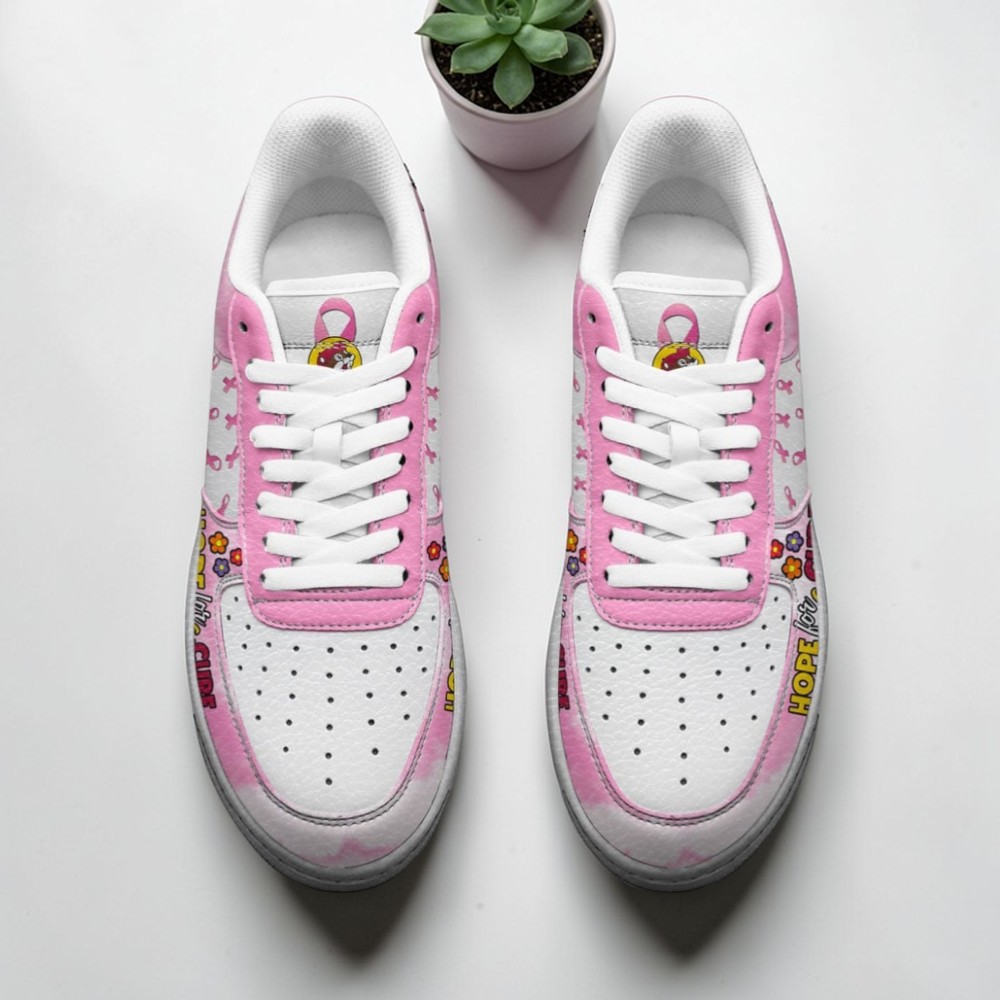 Bold, playful, and unapologetically pink — these shoes wear their message with a confident smile. The design bursts with energy: vibrant ribbon motifs weave through a cheerful pink colorway, punctuated by colorful, cartoon-like typography spelling out HOPE for a CURE. Buc-Ee’s signature branding sits alongside delicate floral accents, bringing a sense of warmth and community to the sneaker’s lively personality. The crisp white sole grounds it all, lending a clean, fresh contrast to the energetic upper. These shoes resonate far beyond aesthetics — they speak to anyone who wants their style to reflect a commitment to something bigger. Women and sneaker enthusiasts who care deeply about breast cancer awareness will find this pair more than just footwear; it’s a statement piece. Wearing them sends a subtle yet powerful message of solidarity, hope, and resilience without saying a word. Ideal for charity events or simply making a meaningful statement while out and about, they fit seamlessly into a lifestyle that values individuality and purpose. Whether gifting to a loved one touched by cancer or adding a bright spark to your own collection, these breast cancer awareness shoes are made for those who carry strength, optimism, and playful spirit in every step.
