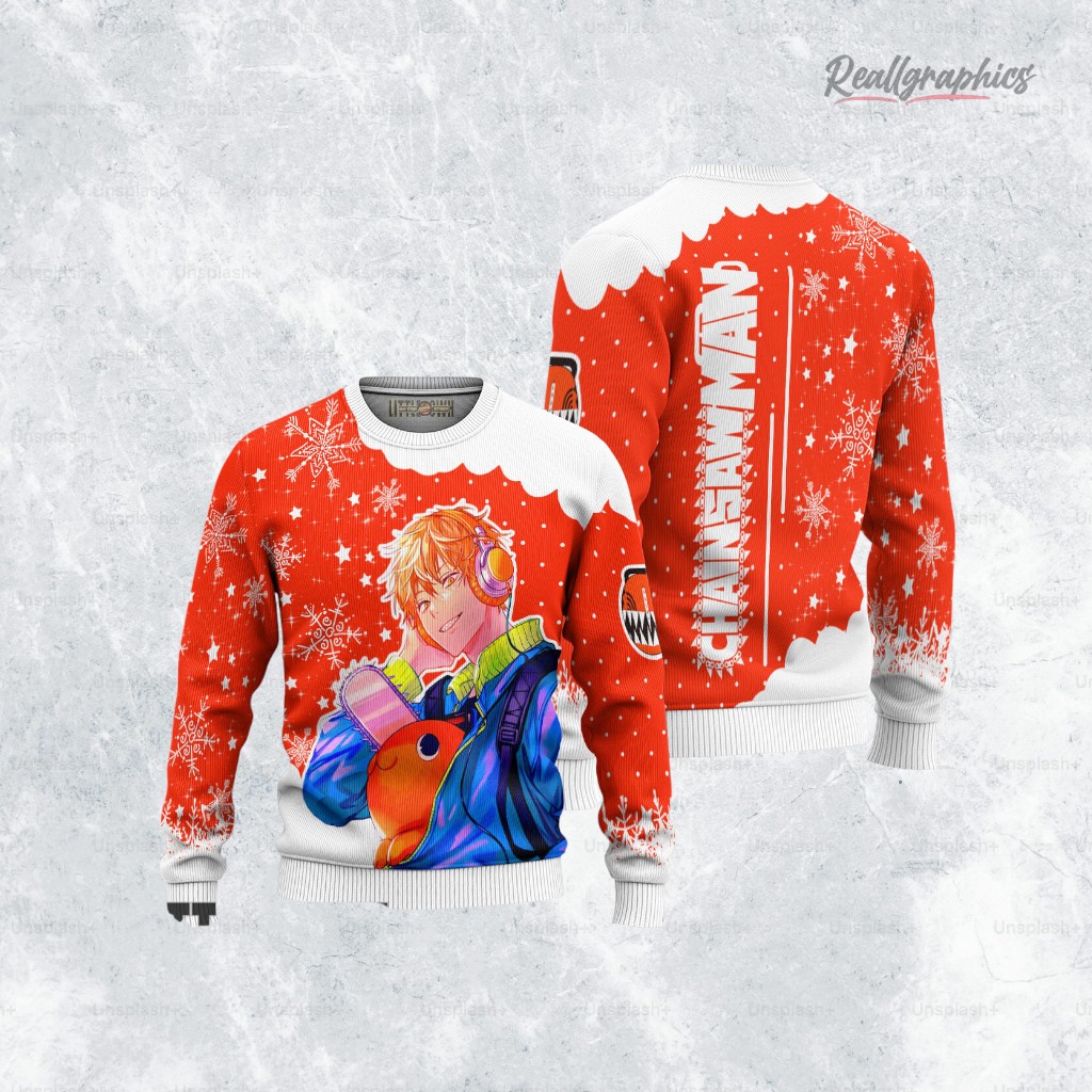 Power up your holiday season! Snuggle up in this awesome anime-inspired Christmas sweater featuring everyone's favorite devil hunter. The perfect cozy gift for any anime fan this Xmas! Get yours now and have a devilishly good holiday!
