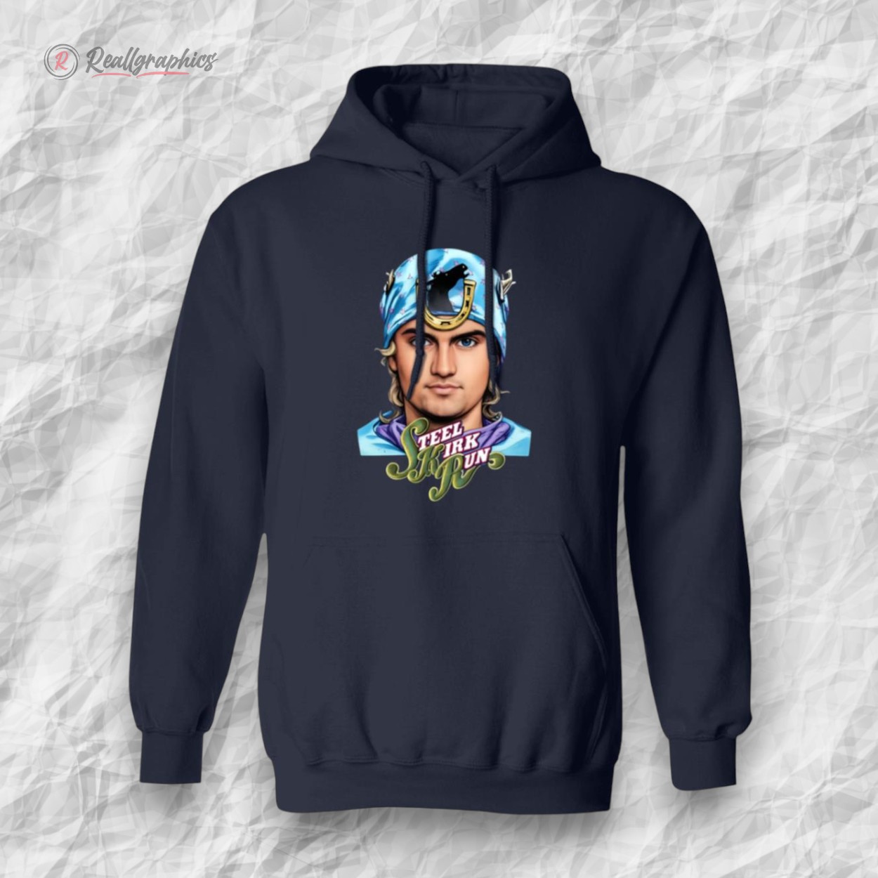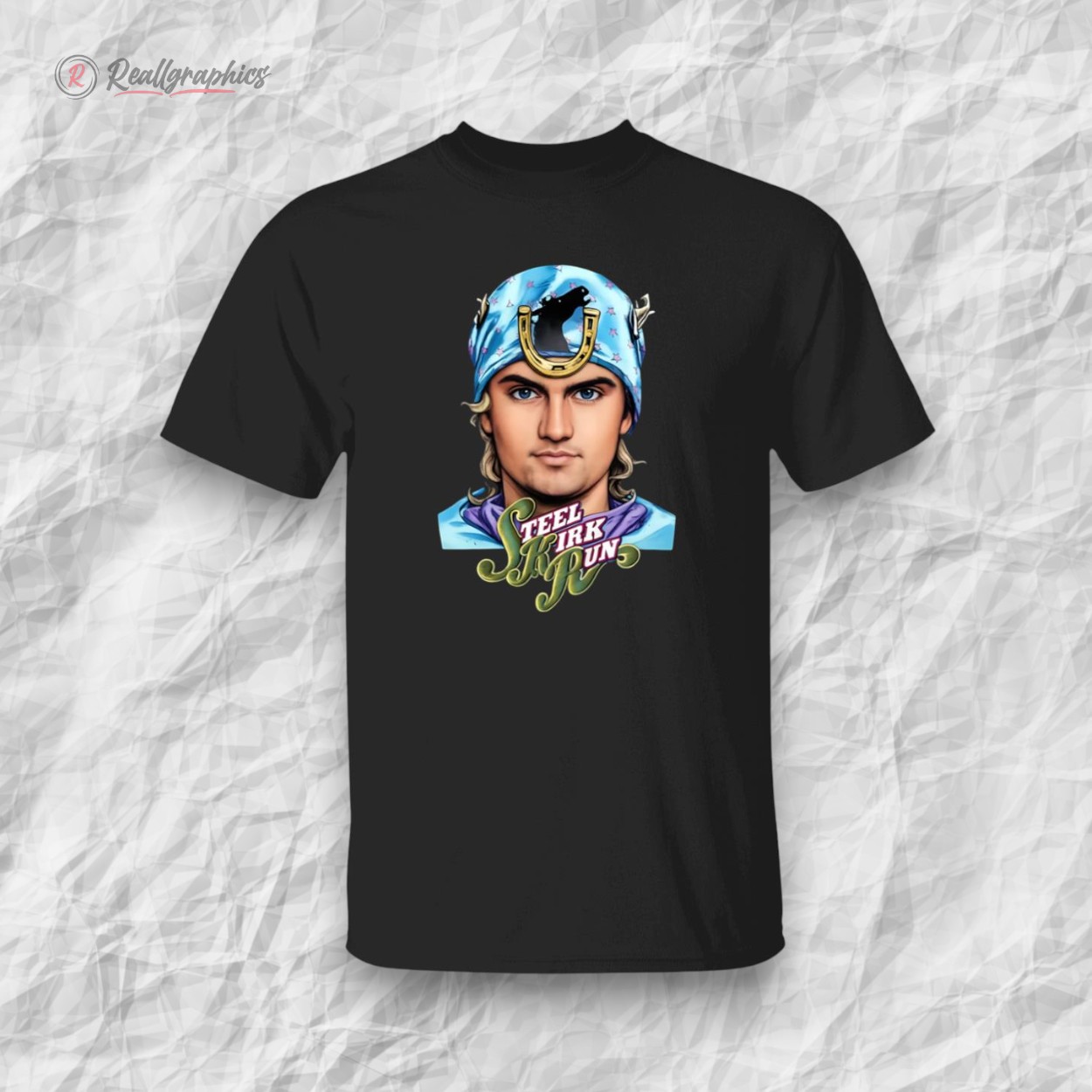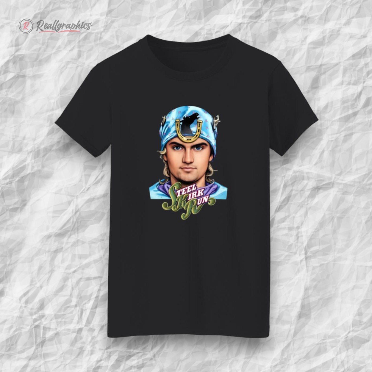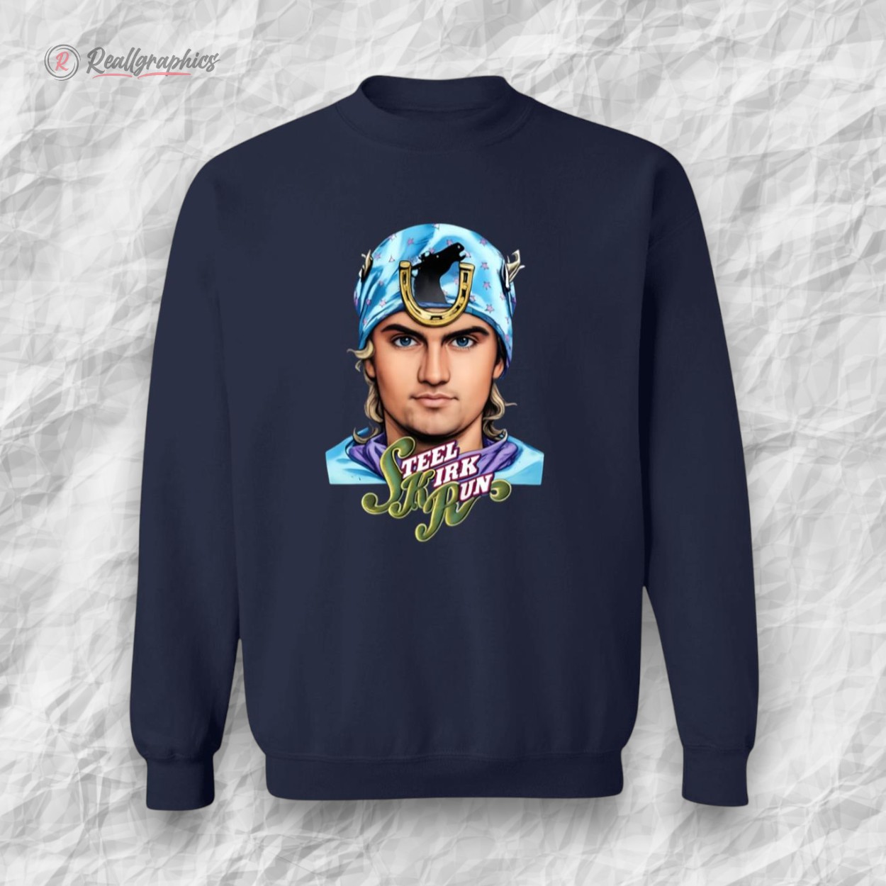 A striking portrait commands the front of this hoodie, where a figure with a bandana and goggles stares out boldly, rendered in a retro pop-art style that jumps with sharp, vivid colors. The graphic’s carefully curved, decorative banner arcs above and below, emblazoned with the phrase Steel Kirk Run in a playful yet defiant multi-color typography. The design strikes a balance between edgy rebellion and a vintage comic-book flair, setting a tone that’s dramatic without feeling overly theatrical. This isn’t just a garment; it’s a statement piece for someone who enjoys layering their personality into their wardrobe. The colors and shapes suggest a wearer unafraid to stir conversation, someone immersed in political commentary or satirical culture who appreciates satire worn on the sleeve—quite literally. The art itself feels like a modern take on countercultural posters, infused with a sharp wit that fans of meme culture and political banter will likely catch and enjoy. Pairing the Charlie Kirk shirt with denim and sturdy sneakers creates a casual look for streetwear or informal events where individuality is a currency. It suits anyone looking to nod toward their fandom without shouting, a fit for those who want their clothing to amplify their voice in subtle, striking ways. As a gift, it resonates with friends who keep political banter lively and appreciate a handcrafted sense of humor in their apparel.
