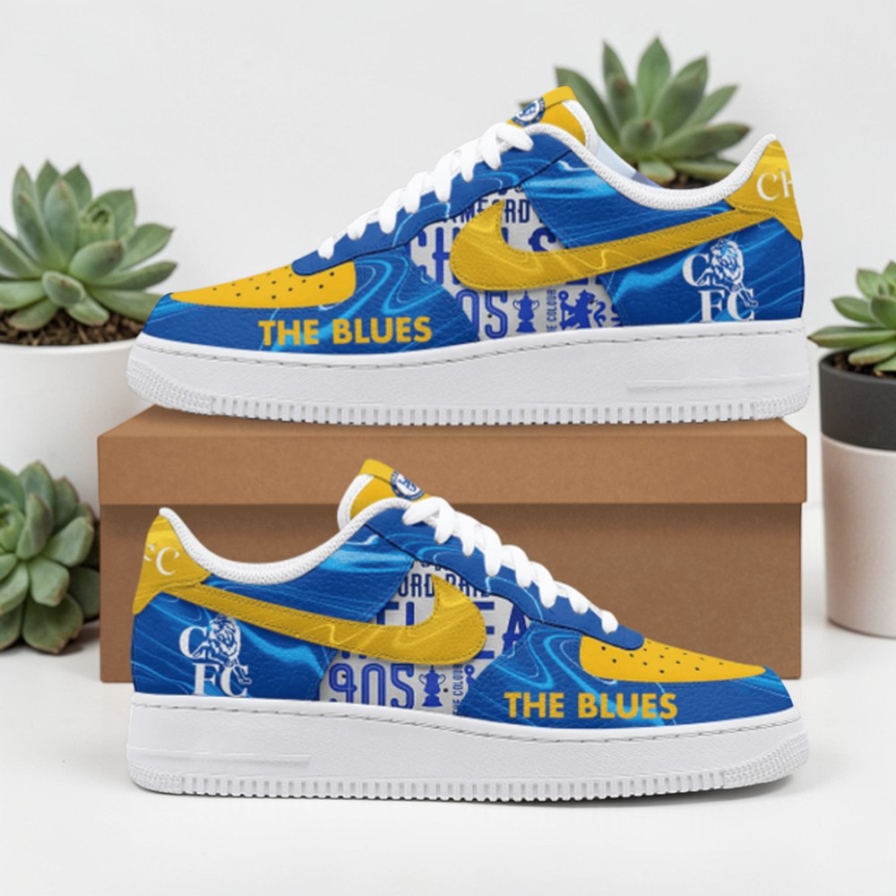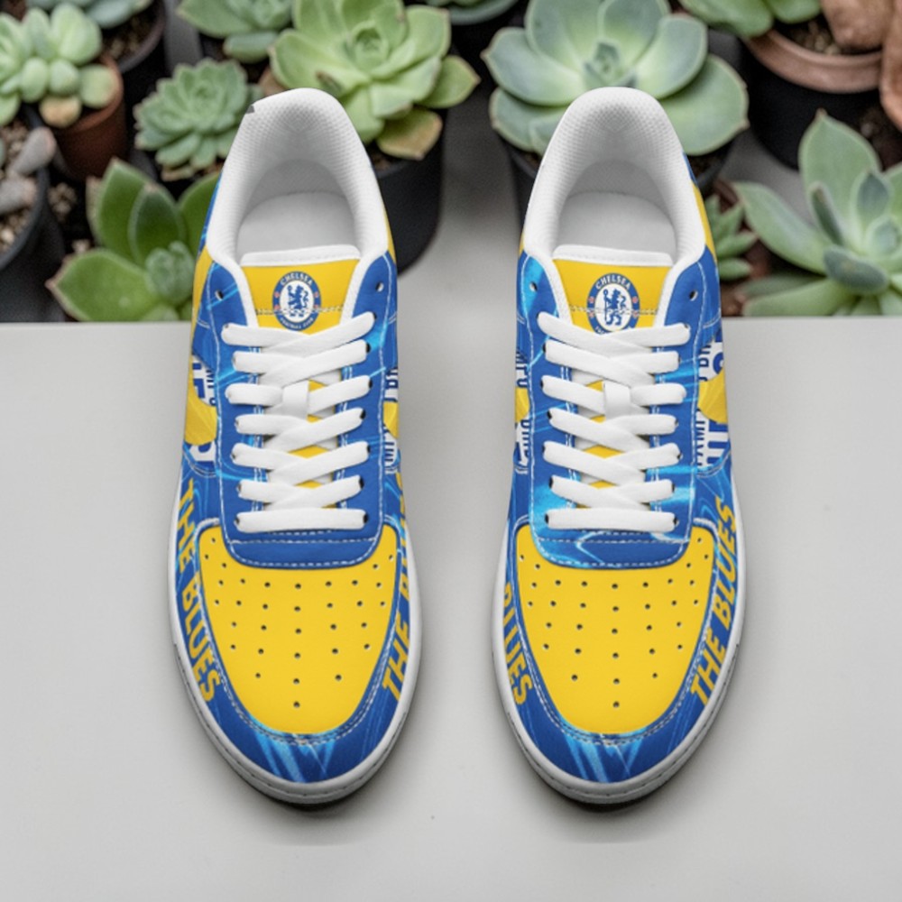 The splash of blue and yellow instantly commands attention, framed by the clean white laces that thread contrast and balance. These Chelsea FC Air Force 1 shoes don’t just carry color—they carry attitude. The vibrant blocks of team color are energized by sharp, bold typography running along the sides, echoing the dynamic spirit of stadium chants and packed terraces. Up close, the perforated yellow toe offers a subtle texture that feels like a nod to the authenticity of football culture, while the Chelsea crest stands proud, a badge that reads loyalty louder than words. These kicks are made for fans who don’t just watch the game—they live it. Whether it’s on match day or in the heart of the city, they pair effortlessly with a casual track jacket or vintage denim, making a statement that’s sporty but far from ordinary. They neighbor well with a relaxed hoodie or even a simple tee, letting the sneakers carry the weight of enthusiasm right from the first step. Those who confidently rock these shoes are unafraid to show where their passions lie, blending the line between athlete and supporter, streetwear lover and diehard fan. They’re perfect for anyone who treasures a bold, energized look and wants to wear their Chelsea pride with both style and comfort. For the collector or the devoted supporter, this footwear is less about sneakers and more about identity—a wearable anthem on and off the pitch.