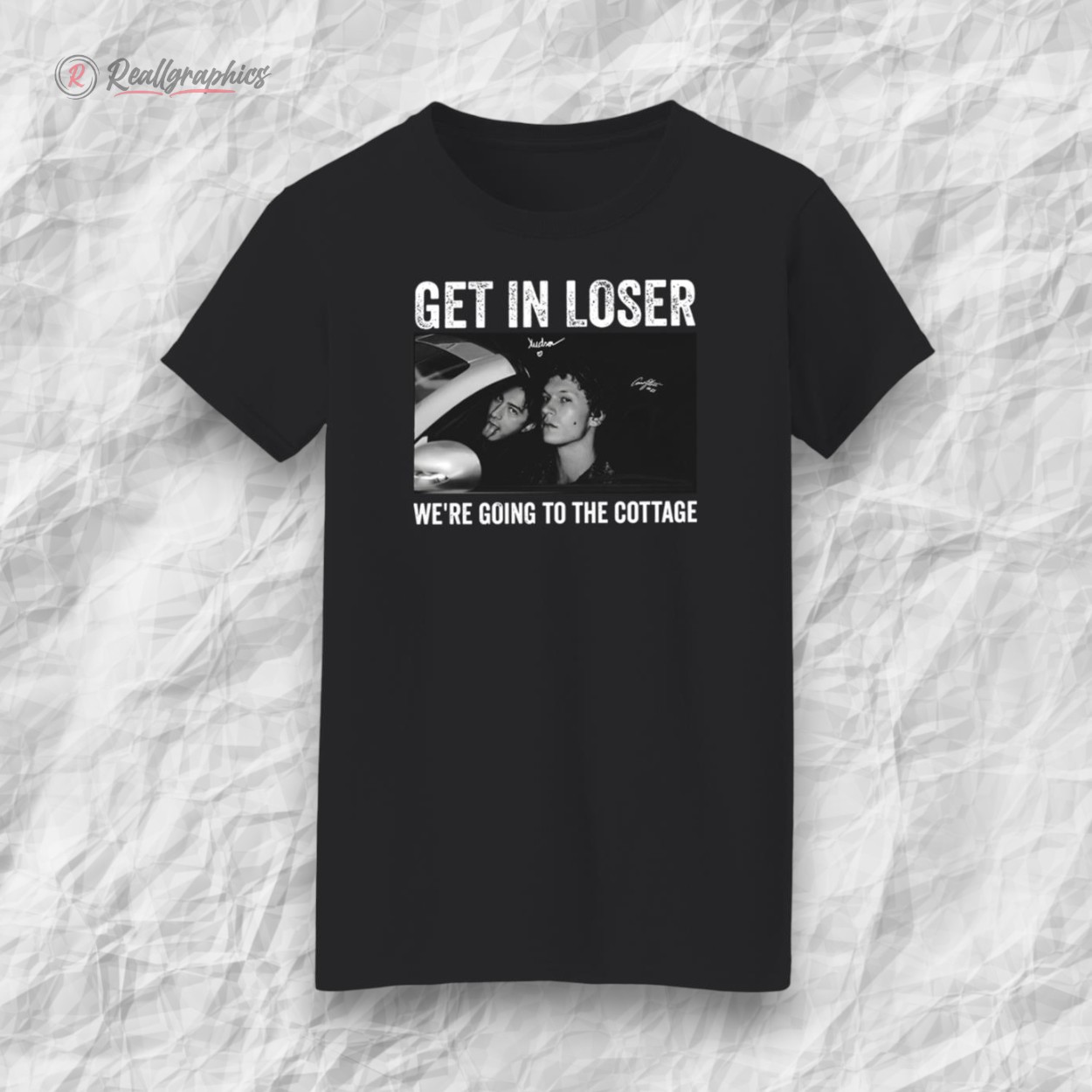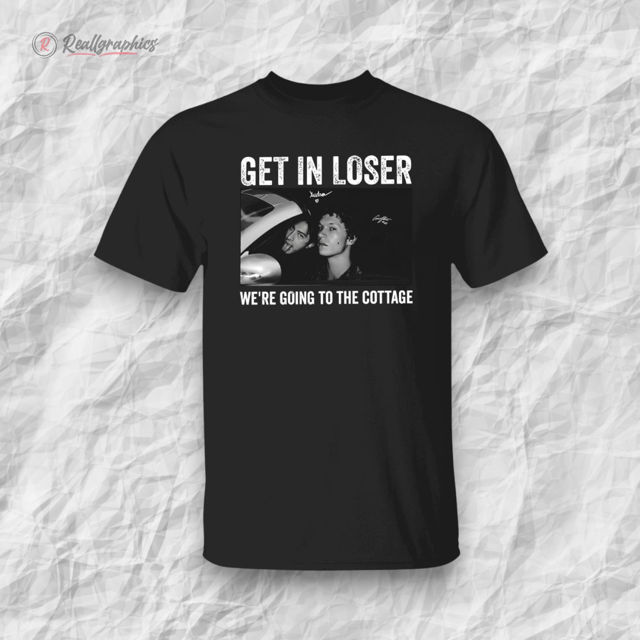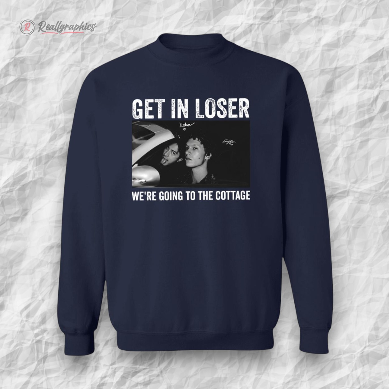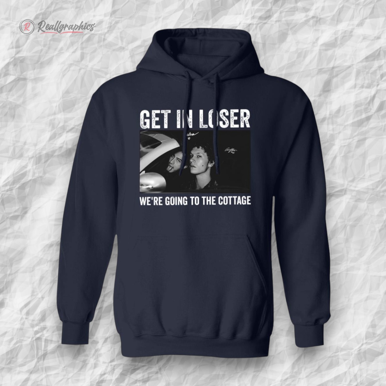 Grey tones shift and blend across the fabric like moments caught in quick snapshots—a chaotic collage that feels both familiar and fresh. Large, blocky text breaks through the visual noise with a weathered grit, spelling out “GET IN LOSER” in a way that demands attention before the smaller, almost conspiratorial subtitle “WE’RE GOING TO THE COTTAGE” can register. It’s a hoodie with attitude, unapologetic in its blend of pop culture nods and streetwise edge. Somewhere between weekend hangouts and late-night adventures, this is the kind of shirt that fits right in with a fearless, self-aware vibe. The distressed typography doesn’t just look cool, it speaks the language of anyone who appreciates humor with an edge—those who thrive on a bit of sarcasm and enjoy making a statement without saying a word directly. This piece isn’t for blending into the background; it’s for the person who knows their crowd and isn’t afraid to call them out with a wink. Pair it with classic denim, chunky sneakers, or a worn-in beanie and it becomes more than clothing—it’s a part of the conversation, an expression of identity. Whether worn to casual meetups or spontaneous weekend escapes, the “get in loser” hoodie fits that moment when humor and style collide effortlessly. It’s something friends who share inside jokes and love a clever twist will not just wear, but live in.