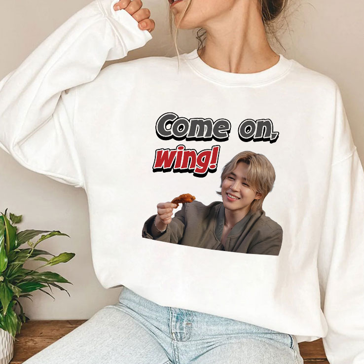 Wearing something that speaks your language without having to say a word—it’s a way of carving out space for yourself in a crowd. This shirt brilliantly captures that vibe with a cheeky nod to pop culture and fandom energy. Front and center is a playful image of Jimin from BTS, holding a piece of fried chicken with an expression that’s equal parts bold and inviting. The phrase Come on, wing! arcs above him in dynamic black and red comic-style letters outlined sharply to make the message pop, like the punchline of a meme brought to life. It’s more than just a graphic tee; it’s a statement of belonging for anyone who finds joy in the shared humor and charisma of K-pop culture, especially those who appreciate Jimin’s charm. The lively composition feels spontaneous, like a moment caught between a concert and a casual hangout with friends, perfect for days when you want your outfit to reflect a playful side without overthinking it. Fans who live and breathe BTS or those who enjoy the quirky blend of anime and meme culture will find this shirt resonates naturally with their aesthetic and attitude. Whether hanging out at fan meetups, grabbing street food with friends, or just adding a touch of fun to everyday wear, this Come on Wing BTS shirt fits right into a lifestyle that balances passion with playfulness. It’s the kind of gift that hits home for anyone who treasures those cultural inside jokes that fuel fandom connections.
