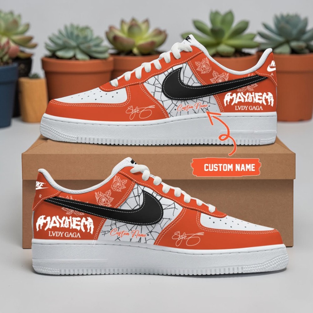 There’s something about a sneaker that grabs your attention the moment you look at it—and these Custom Name Lady Gaga The Mayhem Ball Air Force 1 Shoes do exactly that. The bold splash of orange panels is impossible to miss, contrasted sharply by crisp white and black accents that give the whole design an edgy urban vibe. A large black Nike Swoosh cuts across the side like a graphic statement, while the cracked pattern adds a rough, lived-in feel that’s far from polished but totally purposeful. Look closer, and you’ll find a wild mix of skull and flower motifs tucked into the details, bringing a rebellious flower-punk energy to the shoe. The “MAYHEM” typography jagged in distressed lines hints at a bit of chaos and disruption—perfect if you love loud visuals that tell a story. On top of that, the handwritten script for the custom name puts a personal stamp on each pair, making these more than just sneakers. They’re a shoutout to individuality and a nod to any fan who’s into streetwear with a twist of celebrity-inspired flair. These kicks are ideal for anyone who thrives on bold fashion choices, especially Lady Gaga fans who appreciate her unconventional edge. Whether you’re rocking them on the streets, adding to a collection of standout sneakers, or gifting someone who lives for unique, graphic style, these custom name shoes fit into a lifestyle that’s energetic, playful, and unapologetically different.Custom Name Lady Gaga The Mayhem Ball Air Force 1 Shoes Sneakers
