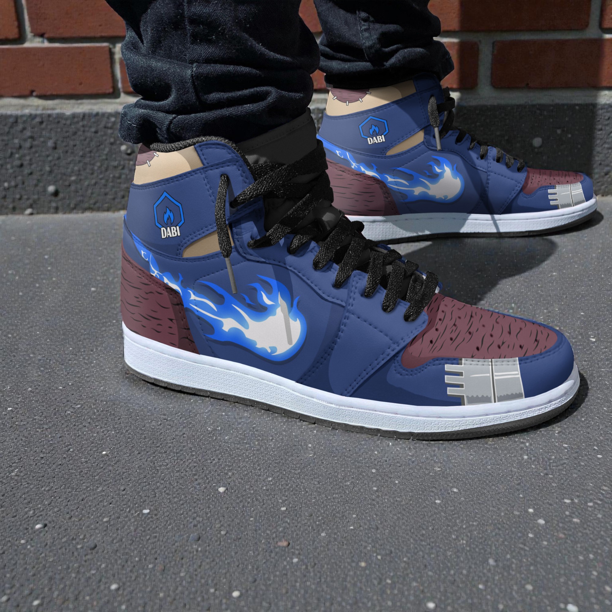 The colorway uses a deep blue base, contrasted with textured burgundy sections and silver staple graphics that directly mimic his stitched, scarred skin. Striking across the side panel is a bright graphic of his signature blue flames, and we finished it off with a custom Dabi flame crest near the ankle collar. It’s a dark, edgy, and highly specific look that other My Hero Academia fans will recognize instantly.