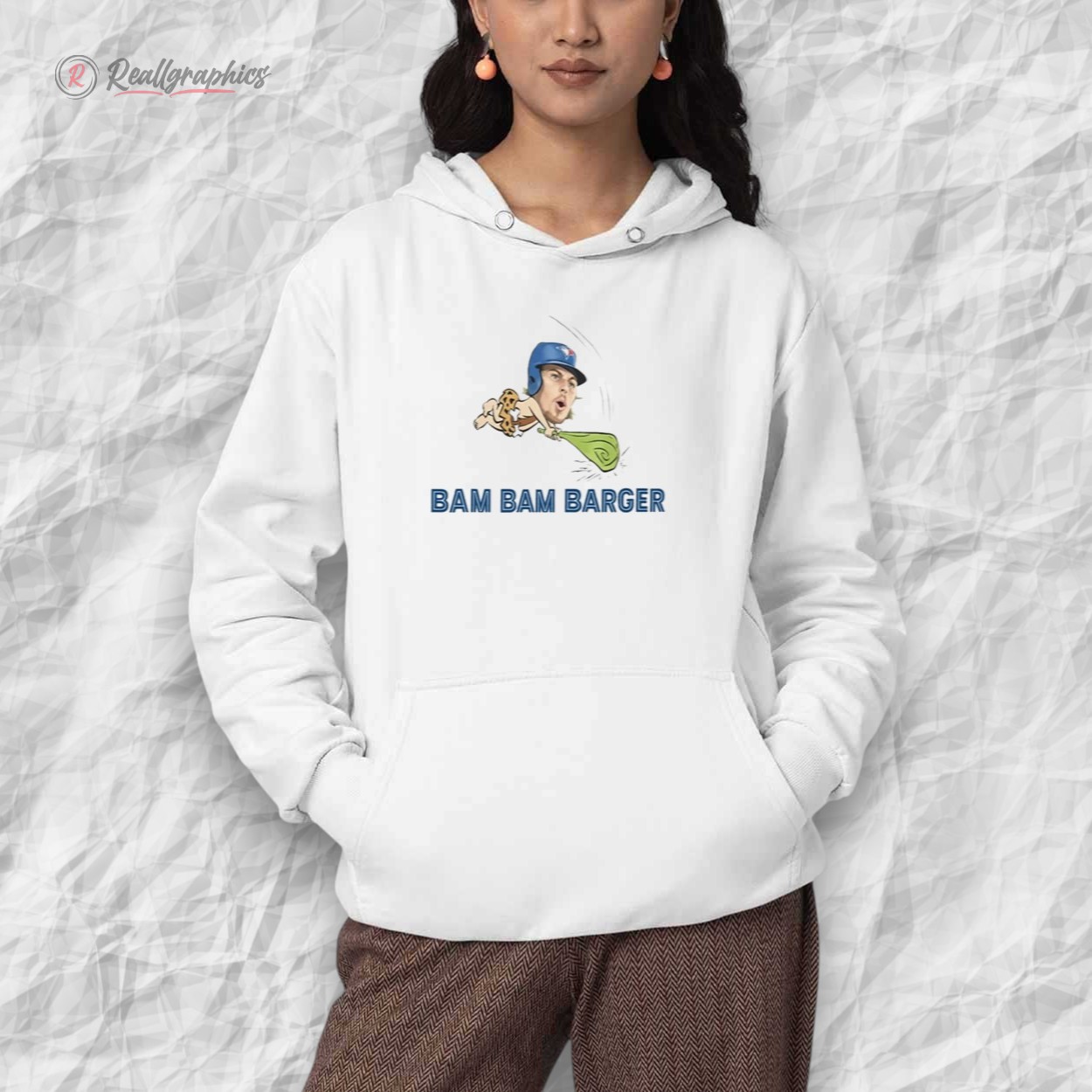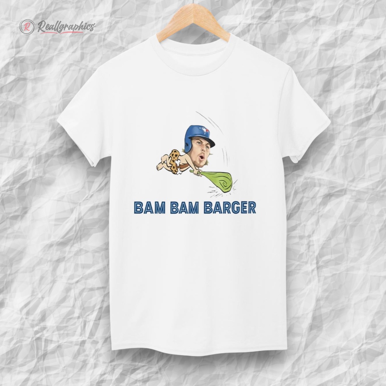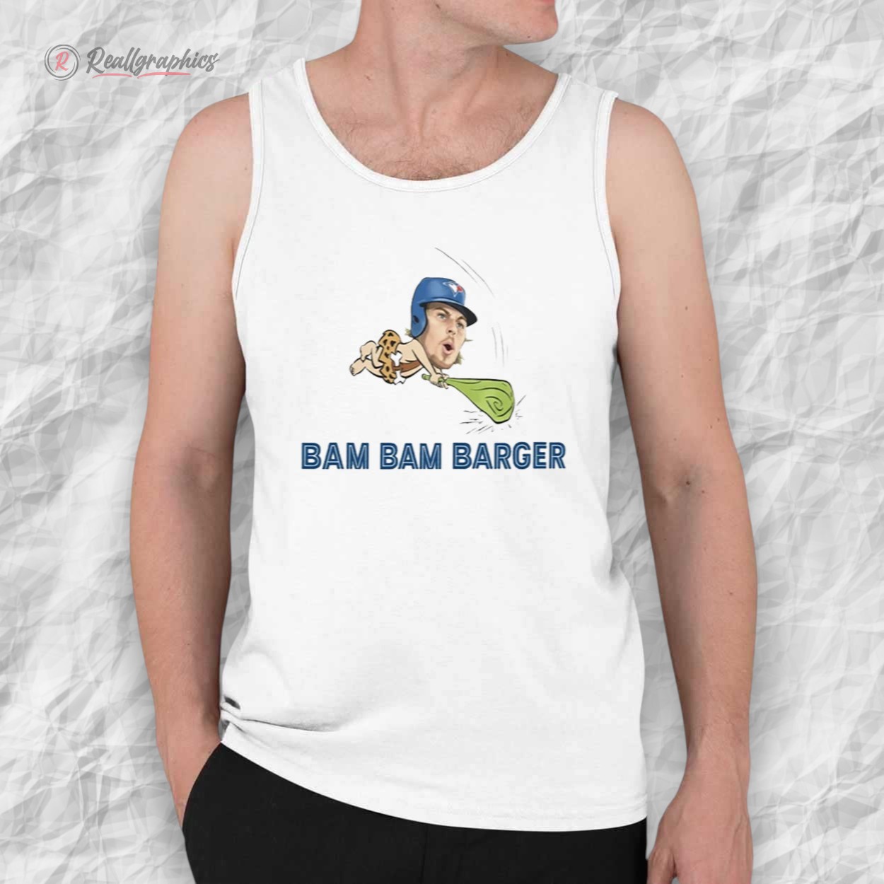 This Bam Bam Barger shirt is the ultimate tribute to Toronto's favorite power-hitting couch surfer. Featuring a wild caricature of Addison "Bam Bam" Barger in full caveman mode, this design captures the raw, unrefined power that he brings to the plate every single at-bat.