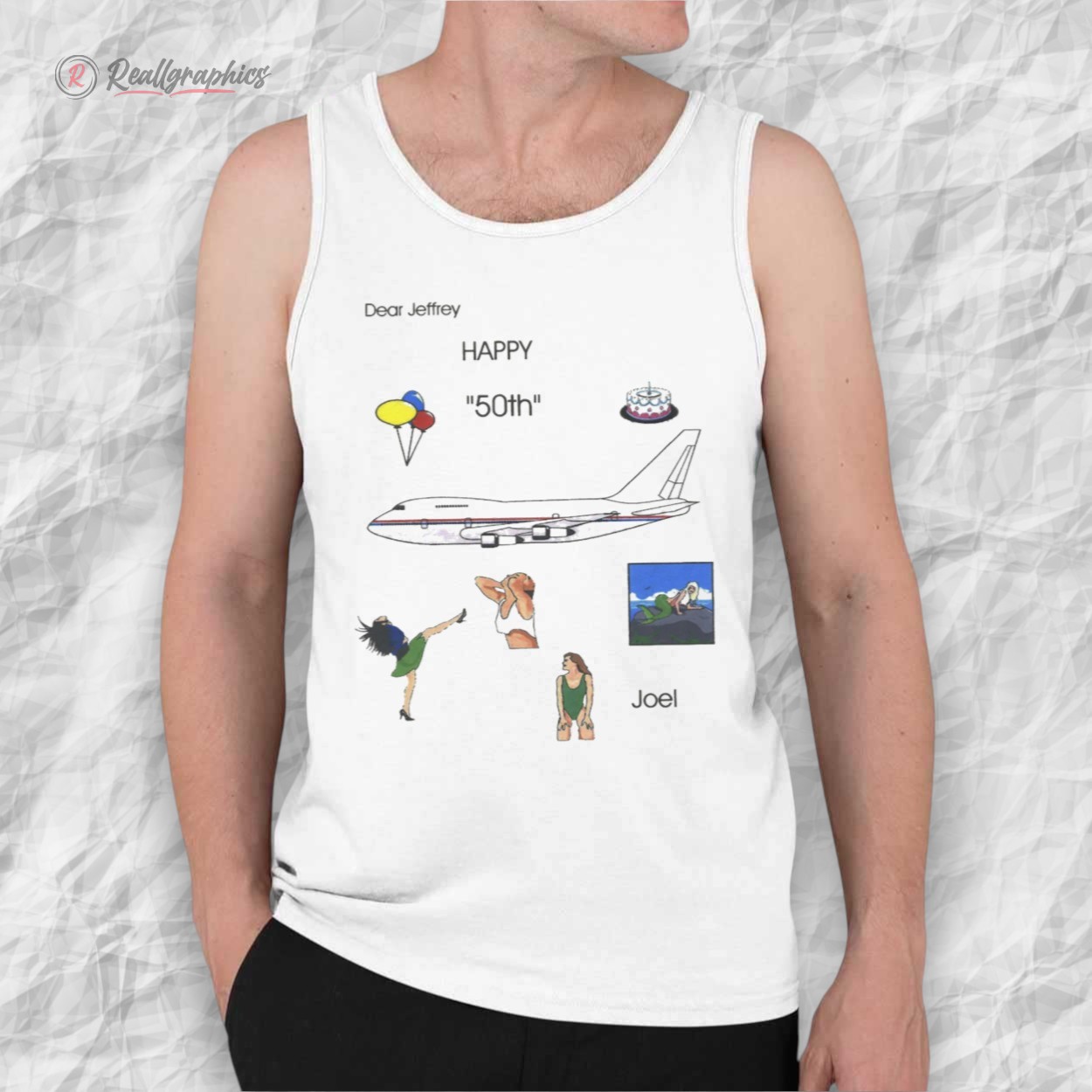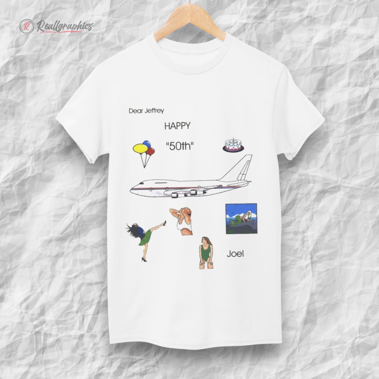 The Dear Jeffrey "Happy 50th" Joel shirt is a masterpiece of "graphic design is my passion" energy. It’s cryptic, it’s chaotic, and it’s undeniably hilarious. Featuring a fever-dream collage of a jumbo jet, a birthday cake, retro clip-art pin-ups, and the bizarrely specific dedication from "Joel," this tee is the definition of a cursed image brought to life.