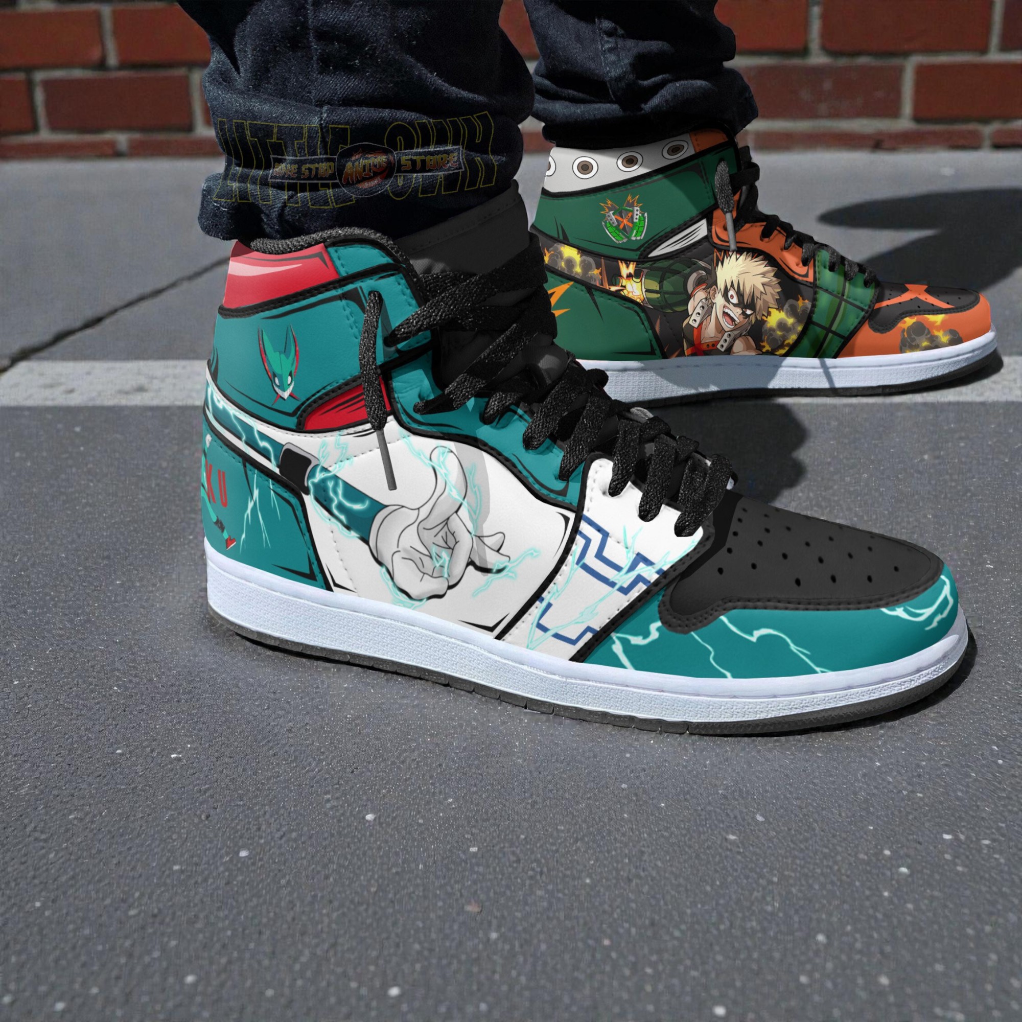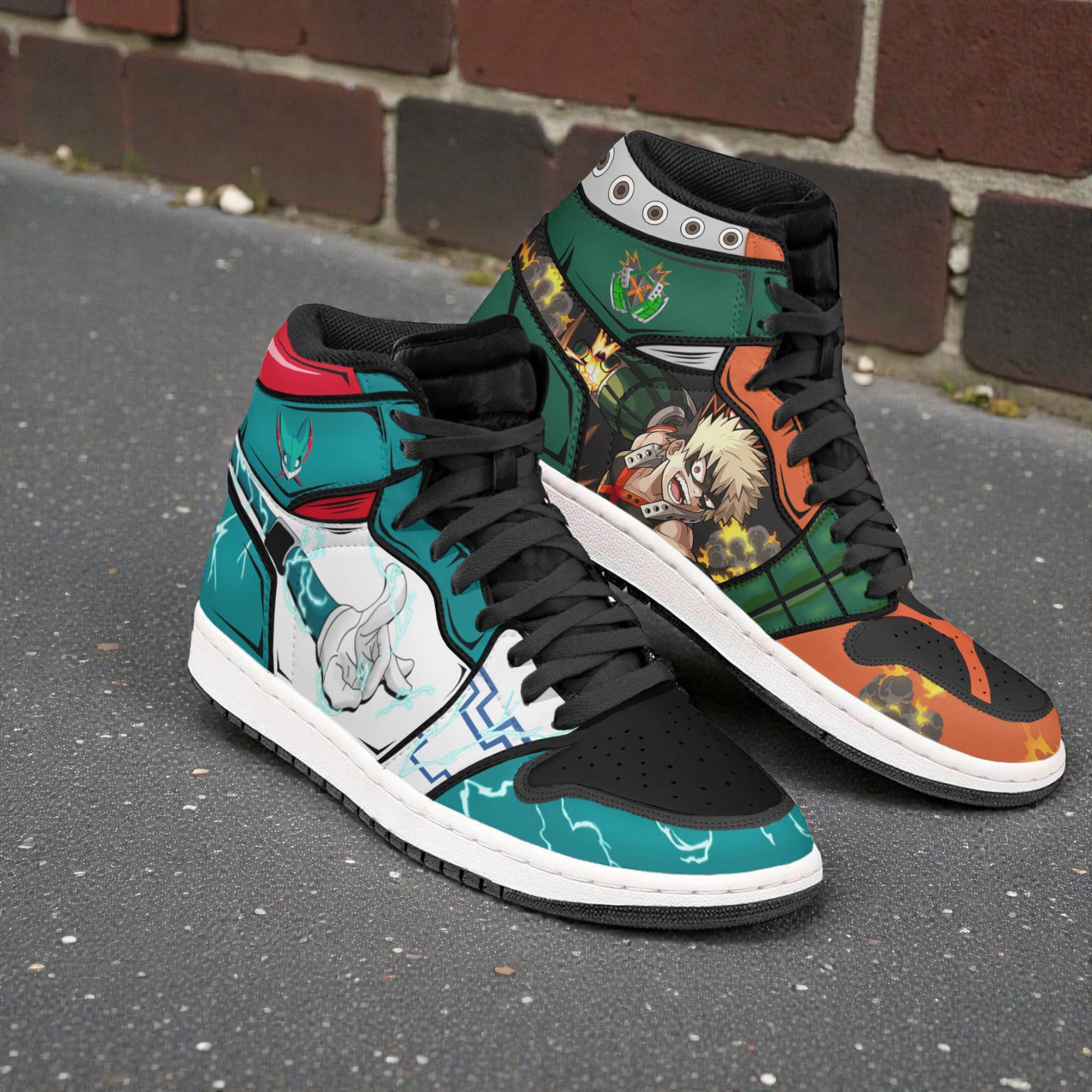 The left shoe is all about Deku’s "Shoot Style," with his signature teal, black, and red colorway, plus the Full Cowl lightning effects. The right shoe switches gears to Bakugo, using the orange, green, and black from his hero suit, complete with his grenade gauntlet and explosion graphics. It’s the perfect way to rep their complicated friendship (and rivalry) at the same time.
