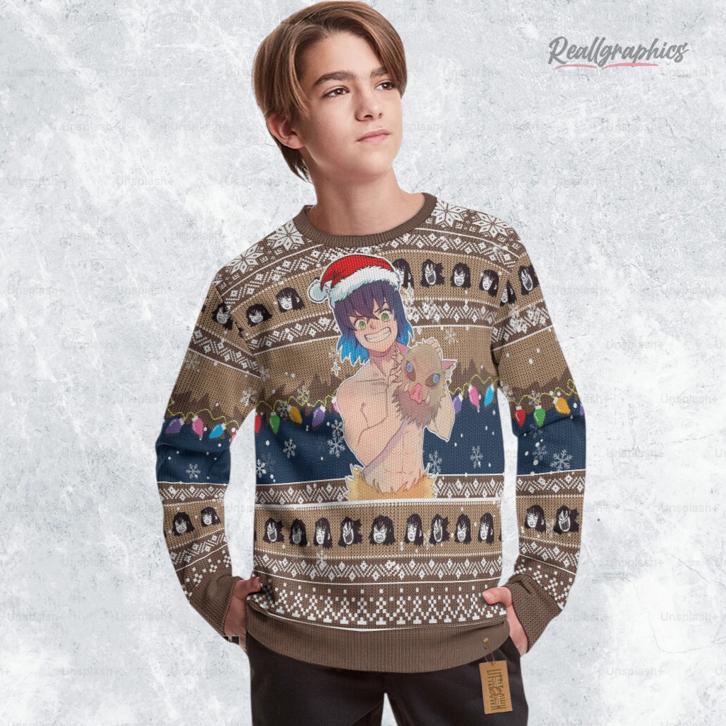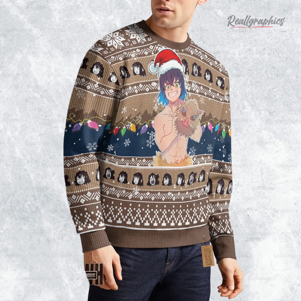 Feeling the festive spirit with a wild twist? This cozy sweater captures Inosuke Hashibira's fearless charm, wrapped in holiday cheer. Imagine Inosuke, sporting a Santa hat, surrounded by playful patterns and colorful lights. It's not just for fans; it’s a joyful statement piece! Ready to add some demon-slaying fun to your holiday wardrobe? Grab yours now and let the festivities begin!