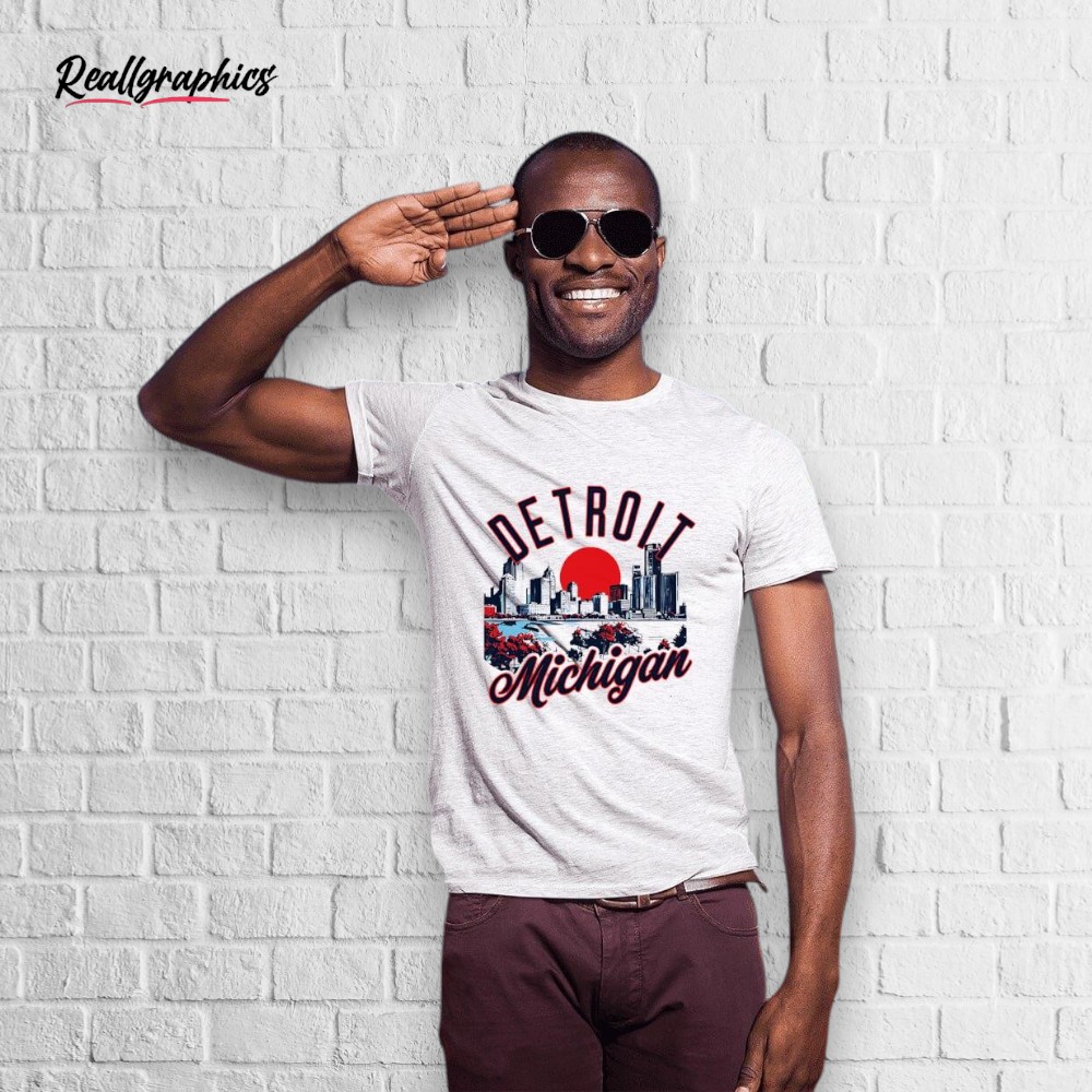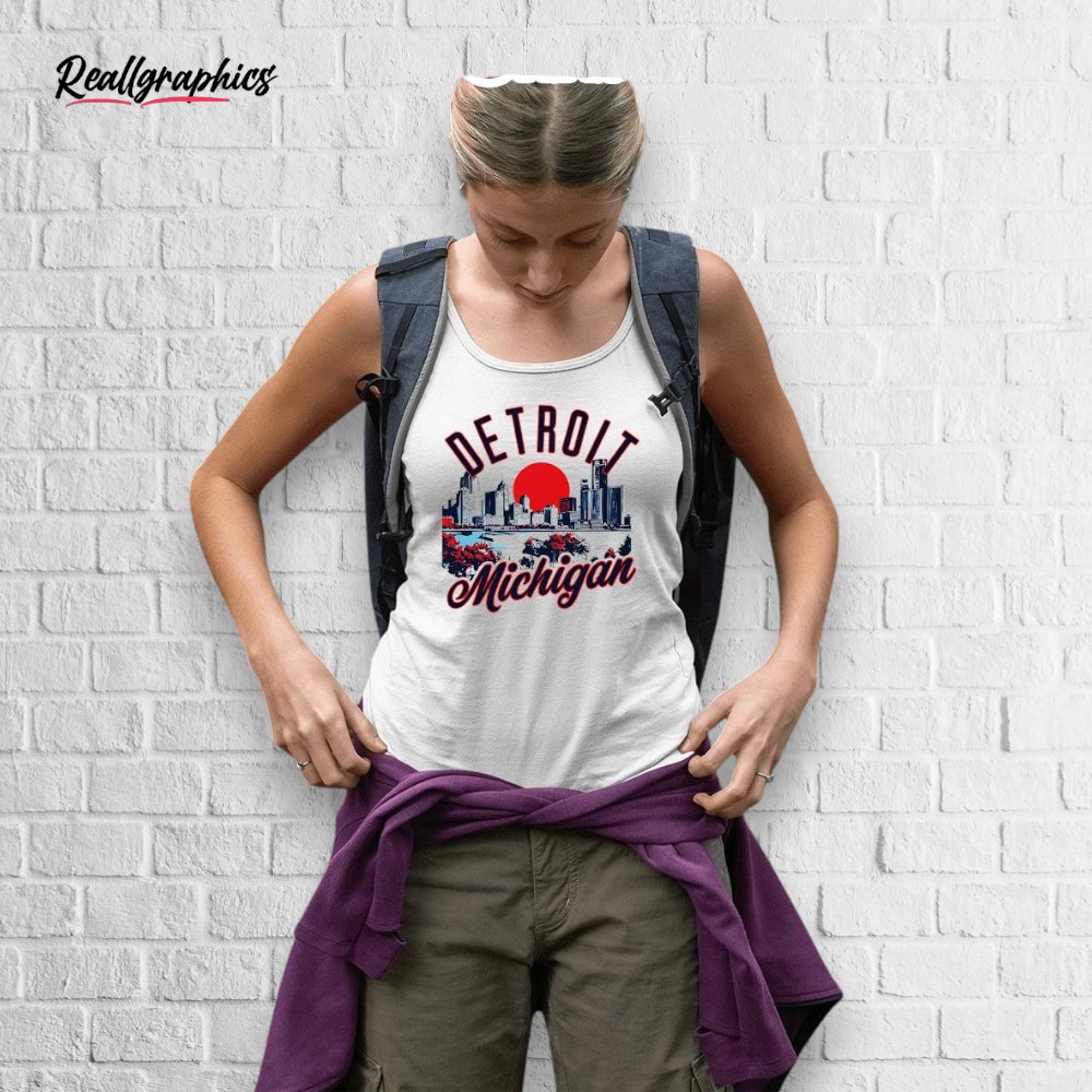 Capture the magic of the Motor City's skyline at dusk with this beautiful shirt. Show your love for Detroit with vibrant colors and iconic buildings silhouetted against a stunning sunset. A perfect way to represent the D.