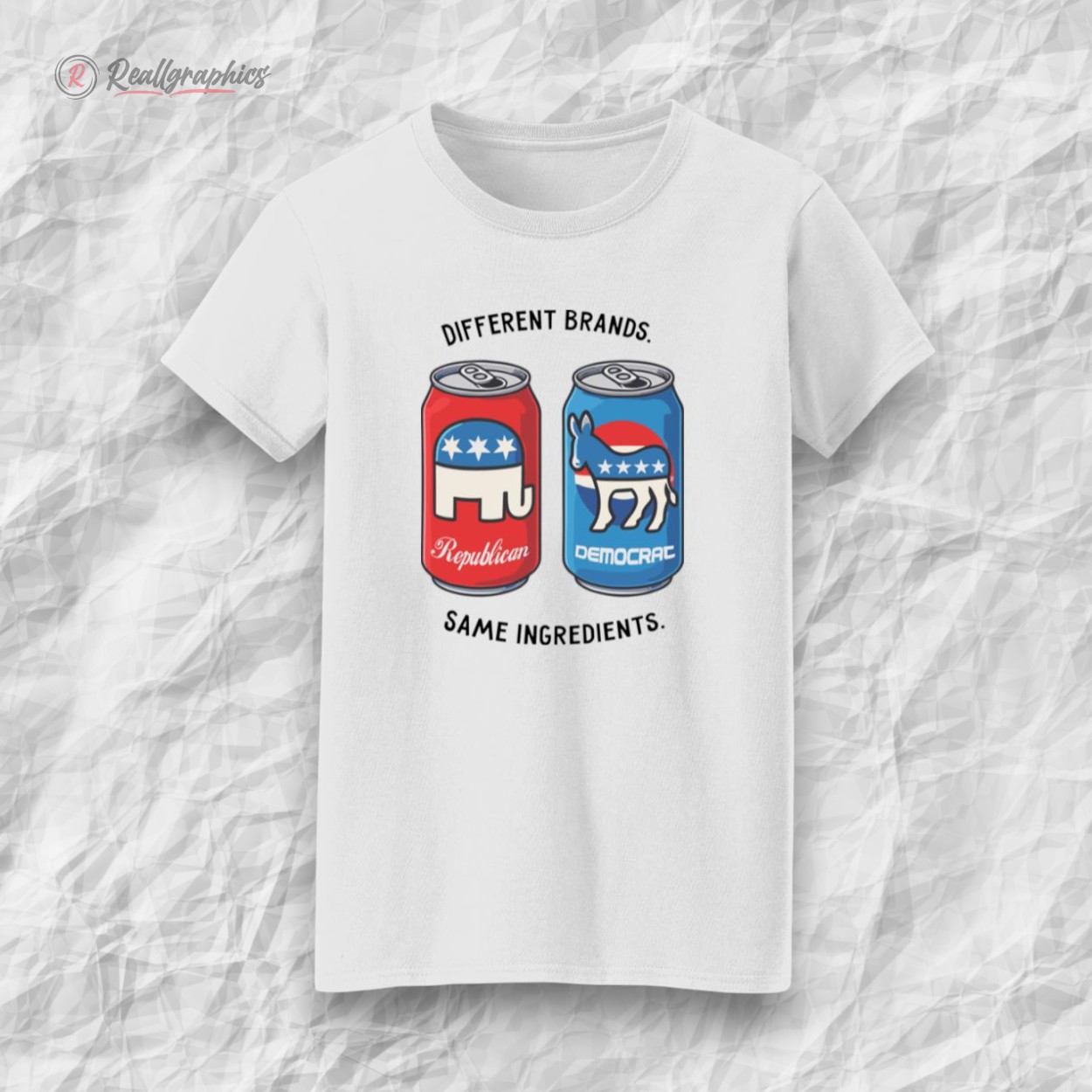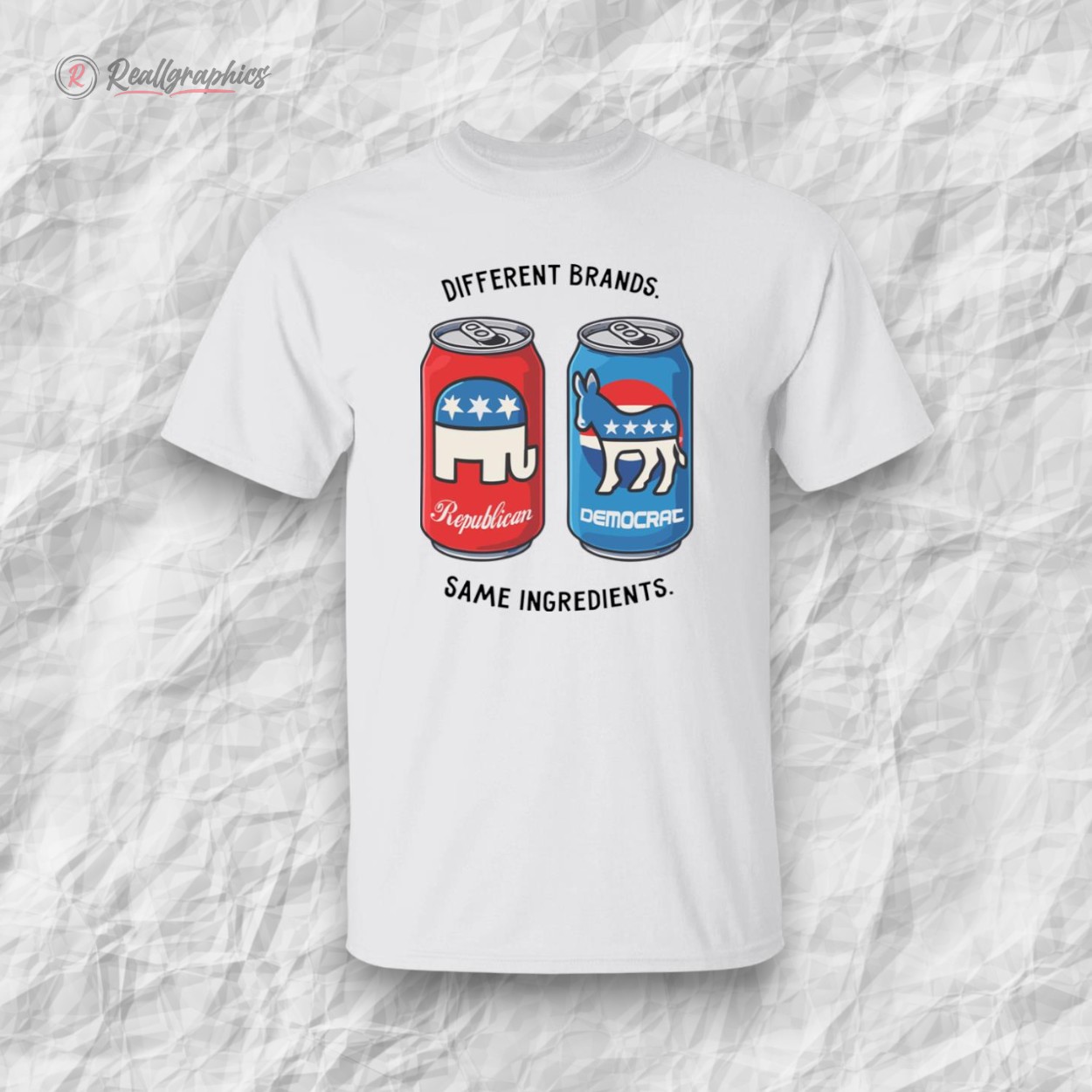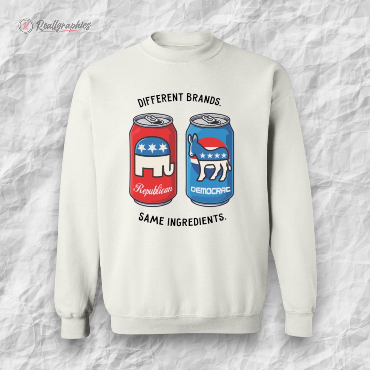 The first thing you notice is how those two soda cans pop off the fabric, bold and cheeky side by side. One sports the familiar Republican elephant, the other the Democrat donkey, each crowned with banners like champions of their own fizz-filled universe. The text arches confidently above and below in all caps, heavy and unapologetic, as if yelling out a truth both parties pretend not to share. It’s playful, irreverent, and funny without losing its bite. This hoodie doesn’t whisper politics; it shouts satire with casual swagger. It’s the kind of shirt that pairs effortlessly with jeans and sneakers, perfect for a weekend rally or just kicking back with friends who enjoy a little political banter without taking it too seriously. Layer it under a jacket or wear it loud on its own—the graphic design has enough presence to hold its own, inviting smirks and maybe a few debates. Anyone who’s tired of the same old partisan noise but still loves a sharp jab at political theater will find themselves at home in this piece. It’s for the folks who like to wear their humor on their sleeves—literally—and maybe spark a conversation while they’re at it. Whether you’re hunting for a gift or adding something playful to your own casual lineup, this different brands same ingredients shirt speaks volumes about shared truths, with a wink and a nod.