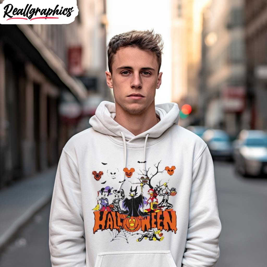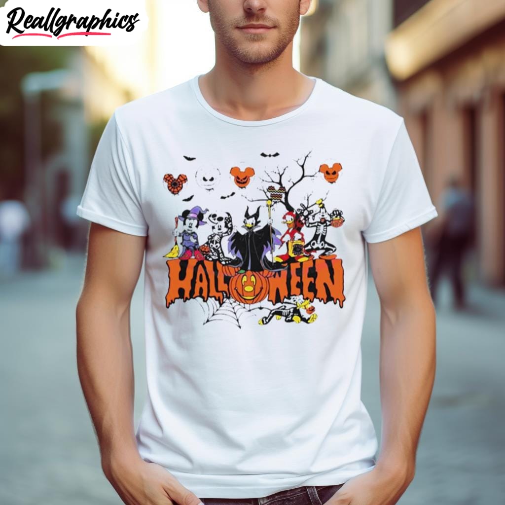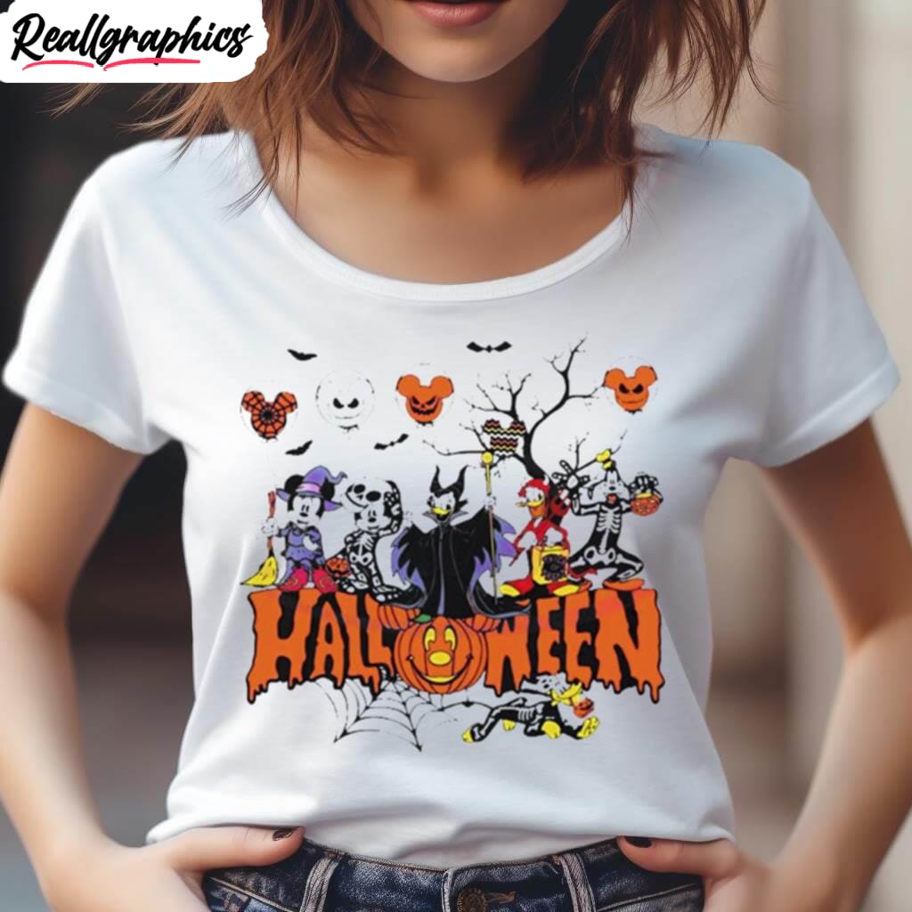 This Disney Halloween Mickey And Friend Villain Shirt is perfect for the spooky season! It features Mickey, Minnie, Donald, Daisy, Goofy, and Pluto as iconic Halloween villains. The design is printed in shades of black, orange, yellow, and green. The bright colors are sure to stand out and make a statement on any day. The comfortable and chic design is the perfect outfit for any Halloween event. From trick-or-treating with the family to a Halloween party, this shirt is certain to get you plenty of attention. It is also a great way to show off your Disney pride!