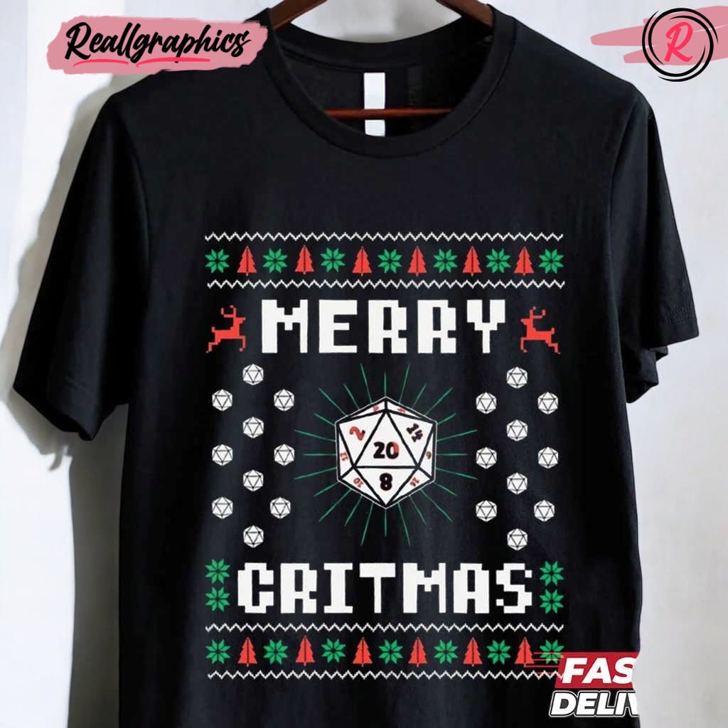 Unleash your inner hero this holiday season with a unique piece of attire that brings your love for the timeless adventure of tabletop gaming into the festive spirit. Celebrate Critmas in style with a shirt that combines the thrilling excitement of your favorite role-playing game with a touch of holiday cheer. Whether you're gathering with your campaign group or exploring dungeons on your own, this shirt serves as the perfect conversation starter and statement piece, highlighting your passion for the fantastic world of role-playing. Ideal for gift-giving or as a personal treat, this shirt is a must-have for every dedicated adventurer embracing the seasonal festivities.