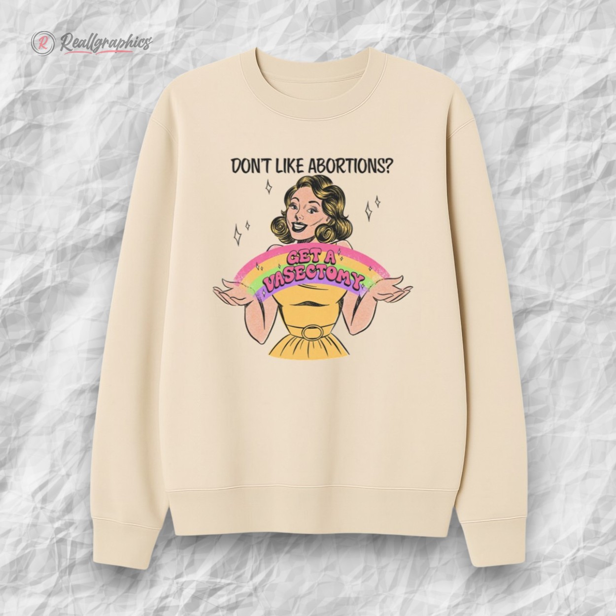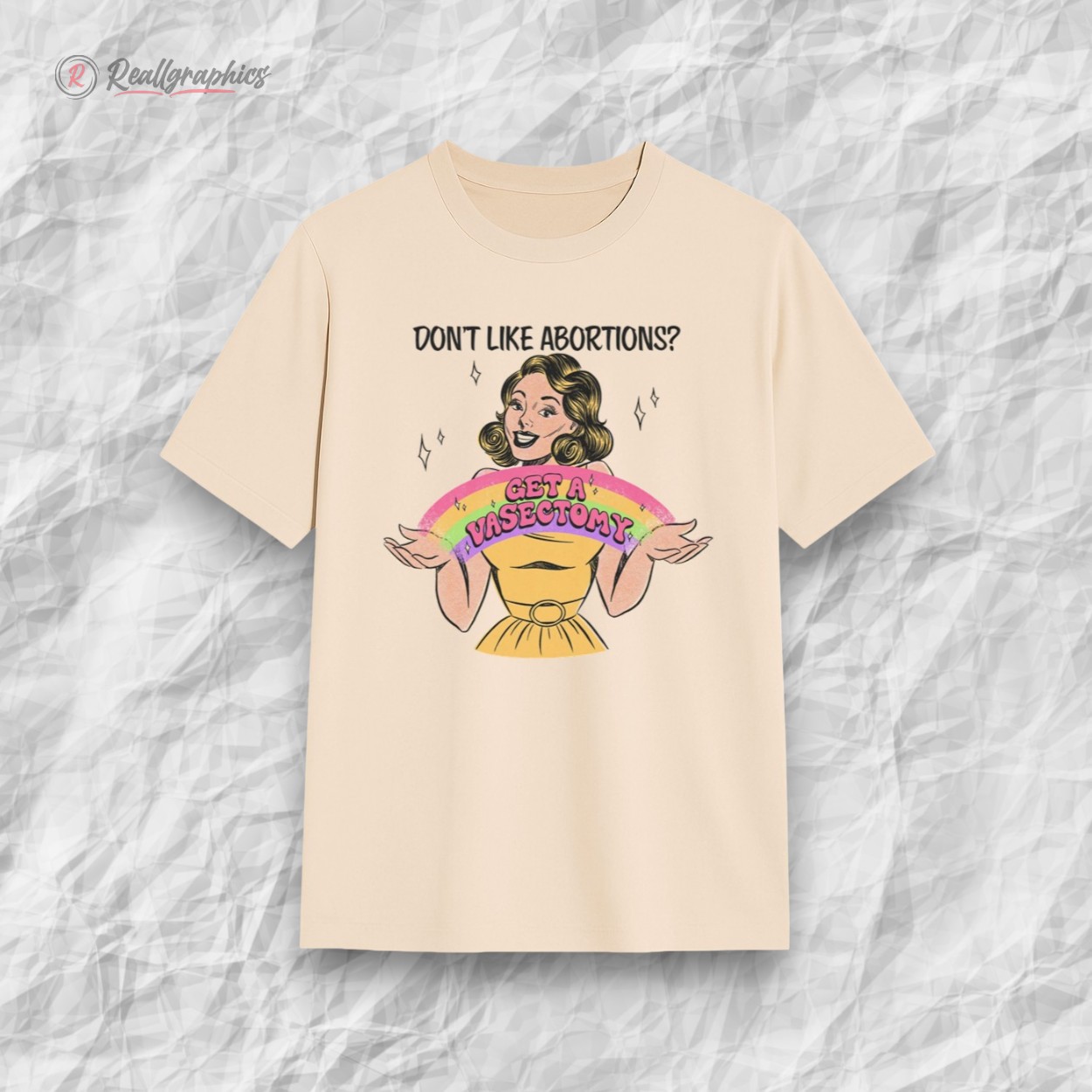 This shirt delivers the ultimate clapback wrapped in a charming retro aesthetic. Featuring a vintage-style pin-up illustration holding a colorful "Get A Vasectomy" banner, this design uses humor and bold logic to shut down the debate before it even starts.