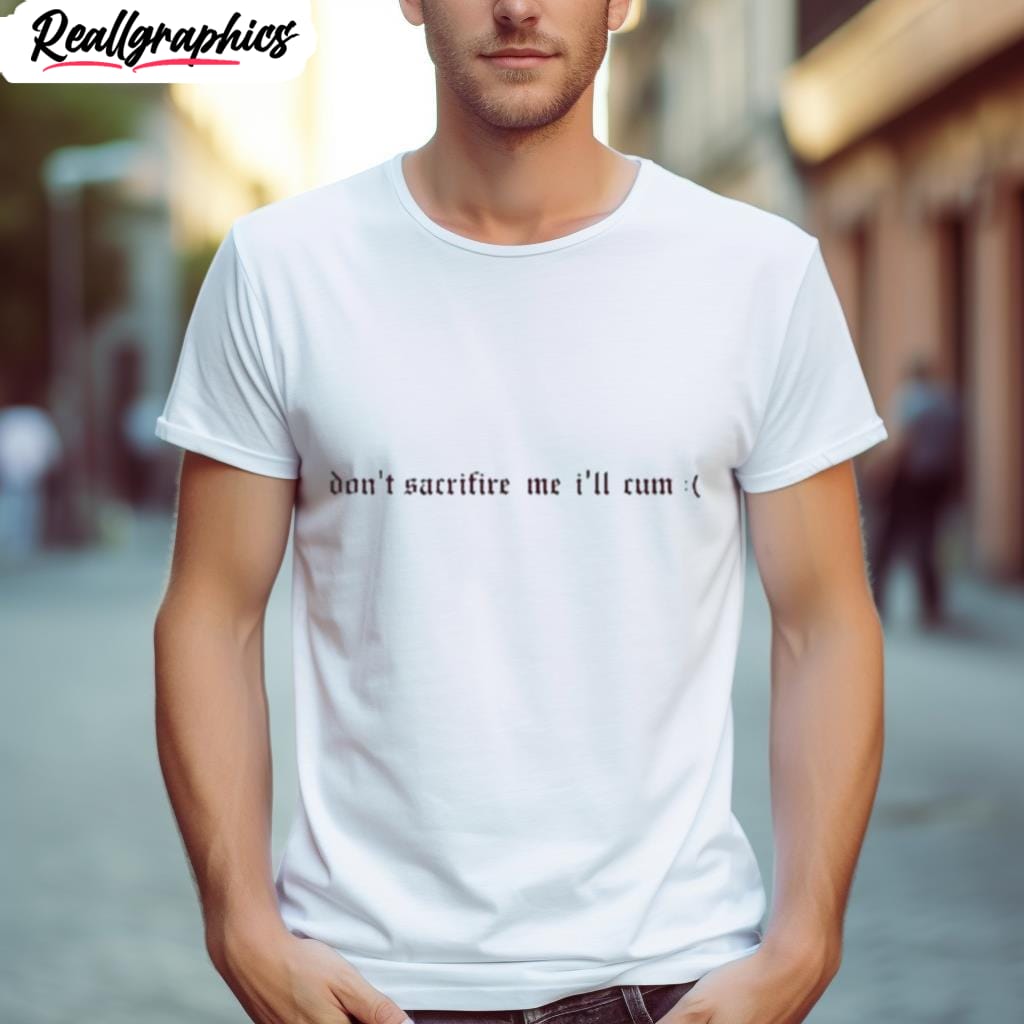 This Dont Sacrifice Me Ill Cum Shirt features a stylishly edgy statement print on a classic white crewneck t-shirt. The bold phrase is imbued with a sense of empowerment. It is composed of a simple yet eye-catching font in a vivid yellow, utilizing the negative space to create maximum impact. The lightweight fabric of the t-shirt fits comfortably and is soft to the touch, ensuring optimum comfort and a flattering fit. This is a perfect choice for anyone looking to make a bold statement, wear their heart on their sleeve, and show off some serious style.