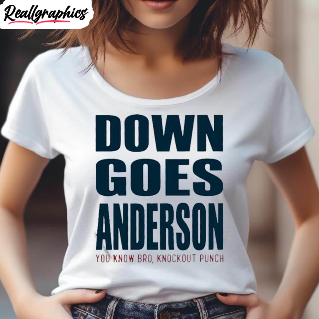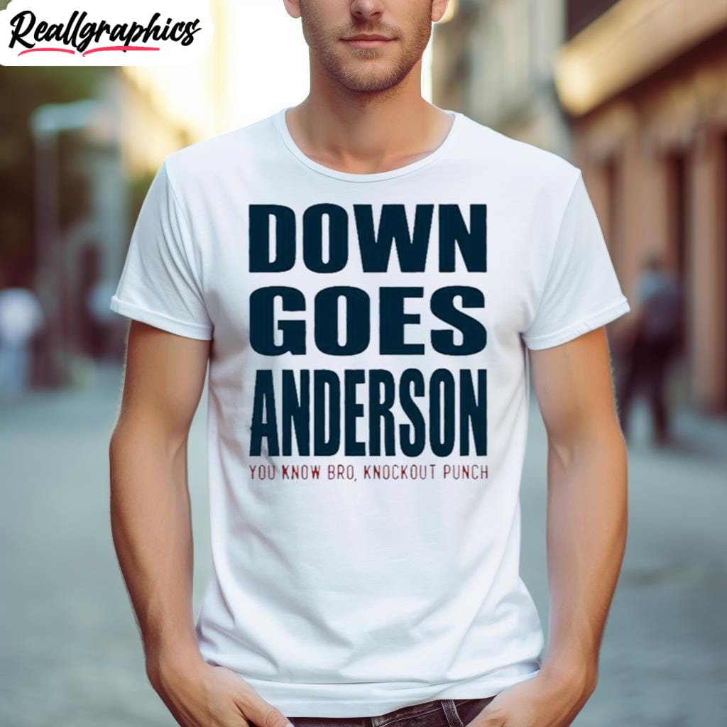 This Down Goes Anderson Know Bro Knockout Punch T-Shirt is perfect for any sports fan. It features a vivid image of Anderson Know Bro delivering a knockout punch. The vibrant colors and detailed design ensure the shirt will look great no matter where you wear it. It is made from 100% cotton for maximum comfort and durability. It is perfect for the gym, outdoor activities, or just for simply displaying your support for Anderson Know Bro. This shirt is a must-have for any sporting enthusiast.
