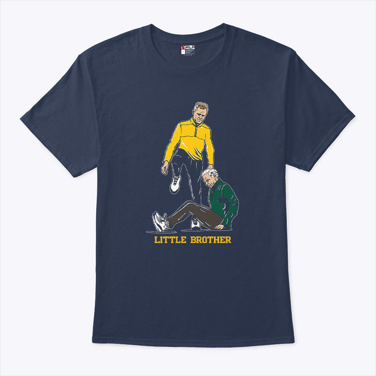 Sibling dynamics often come with a playful edge, the kind that’s part teasing rivalry, part unspoken loyalty. On a navy blue canvas, this tee captures that vibe through a sharp pop-art inspired scene. Two figures face off—one stands in a bright yellow shirt, assertive and ready, while the other sits calmly in green, seemingly unfazed yet clearly engaged. The bold, uppercase yellow text “Little Brother” anchors the design, adding a bit of cheeky pride to the moment. The illustrated confrontation feels less like conflict and more like a spirited exchange, the kind that happens in family rooms, on weekend trips, or during casual hangouts. This isn’t just about fandom; it’s about wearing something that mirrors the push and pull of sibling relationships, especially for those who live that balance daily. Brothers who thrive on a bit of competition but always have each other’s backs would naturally connect with this design. It hangs comfortably among casual wear suited for weekends, backyard barbecues, or post-game chill sessions. Whether given as a gift or picked out by someone keen to celebrate that little brother role with a knowing wink, this tee fits into the rhythms of everyday life where identity and family meet in quiet yet expressive ways.