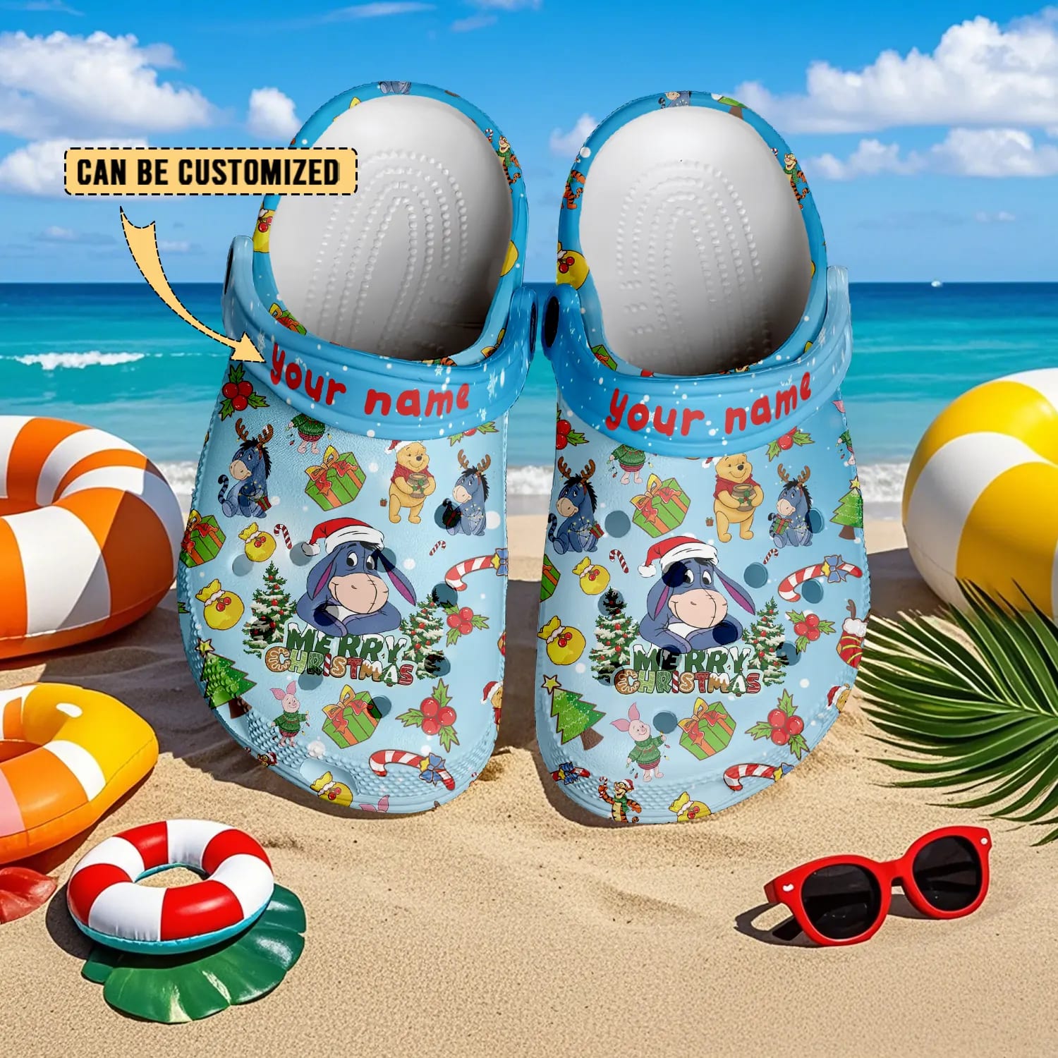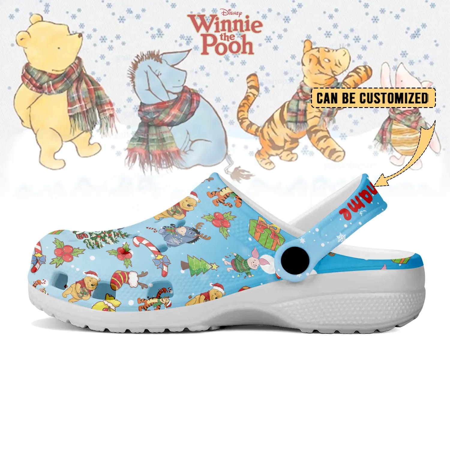 Celebrate the holidays with everyone’s favorite bear in these Disney Winnie the Pooh Merry Christmas Personalized Clogs. Featuring adorable Christmas artwork with Winnie the Pooh, Eeyore, Piglet, and festive winter details, this pair is full of warmth, joy, and classic Disney charm.