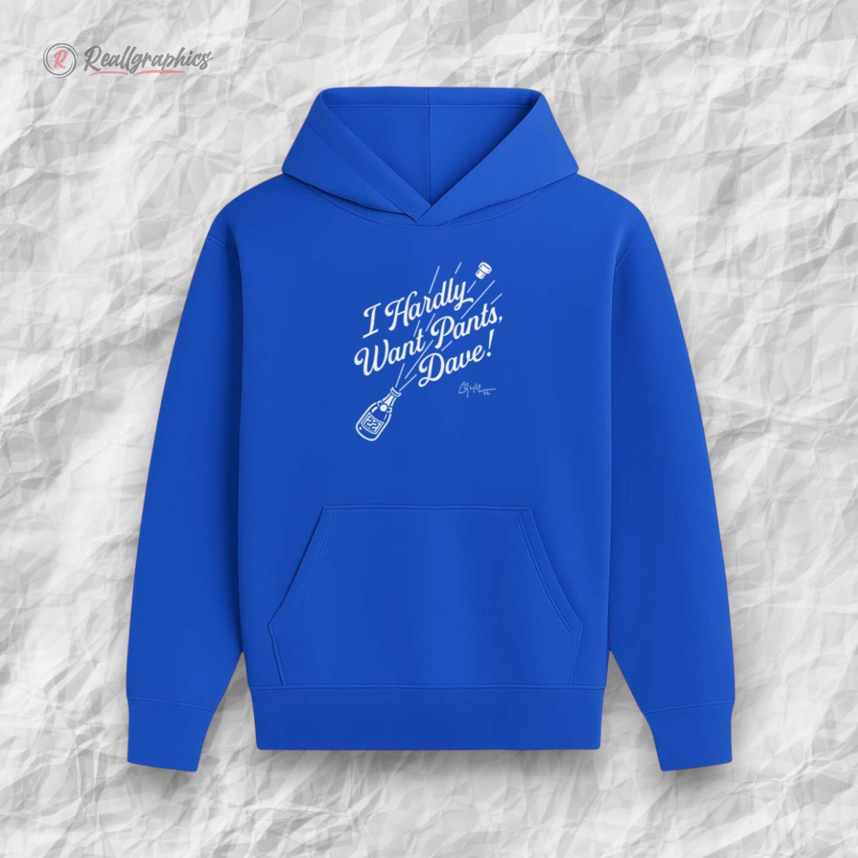 Nothing says "victory" like a popping cork and a quote that will live in clubhouse infamy. This premium sweatshirt captures the energy of a post-game celebration with a design that is as spirited as the players themselves. The clean white script on a vibrant blue canvas creates a high-contrast look that is perfect for any occasion where pants are optional (but highly recommended).