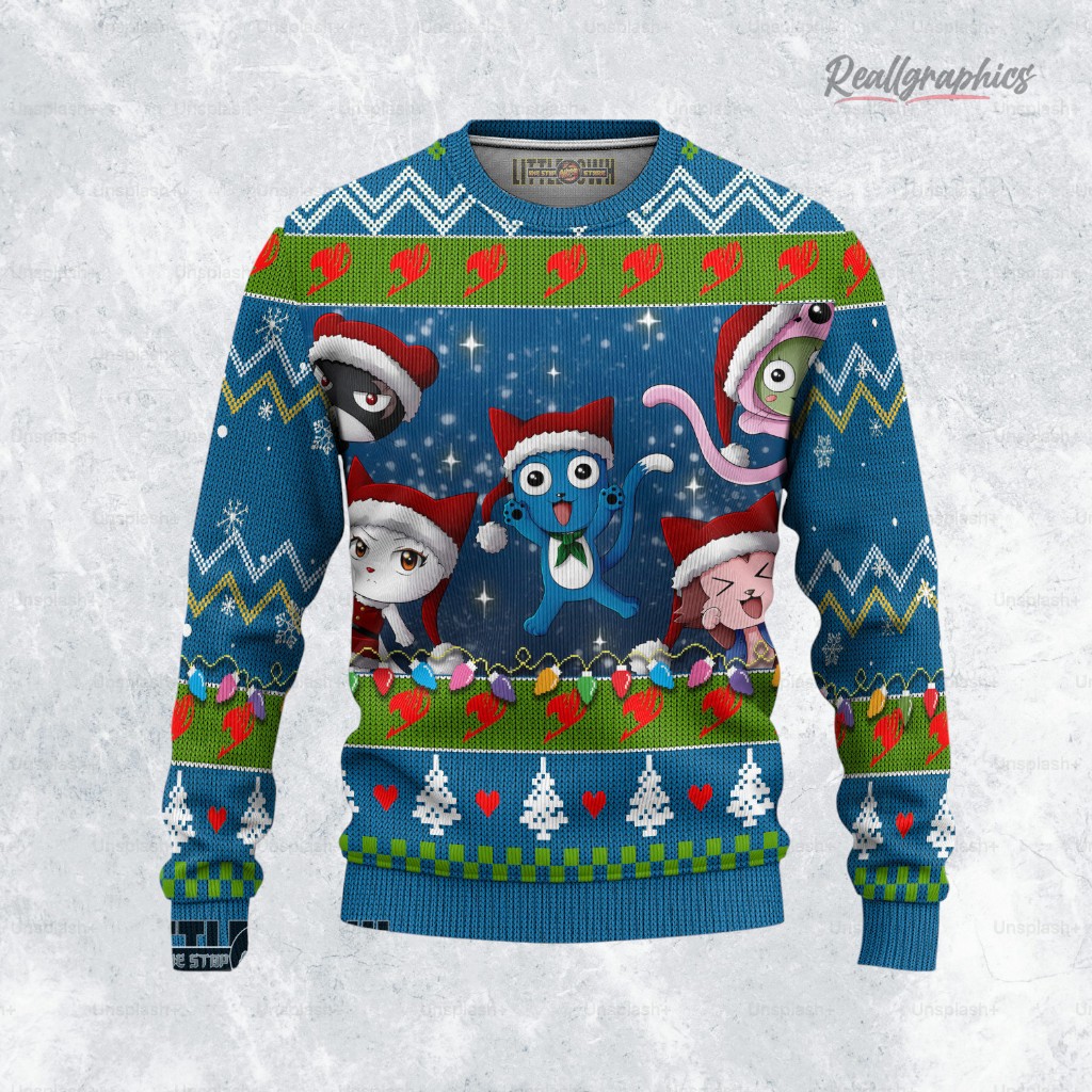 Get ready to sleigh the holidays with this adorable custom anime sweatshirt! Featuring everyone's favorite blue cat and friends, it's the perfect cozy and festive way to show off your anime love this Christmas. Grab yours now and spread some holiday cheer! 🎄 Fairy Tail Ugly Christmas Sweater Happy and Friend Custom Anime Sweatshirt