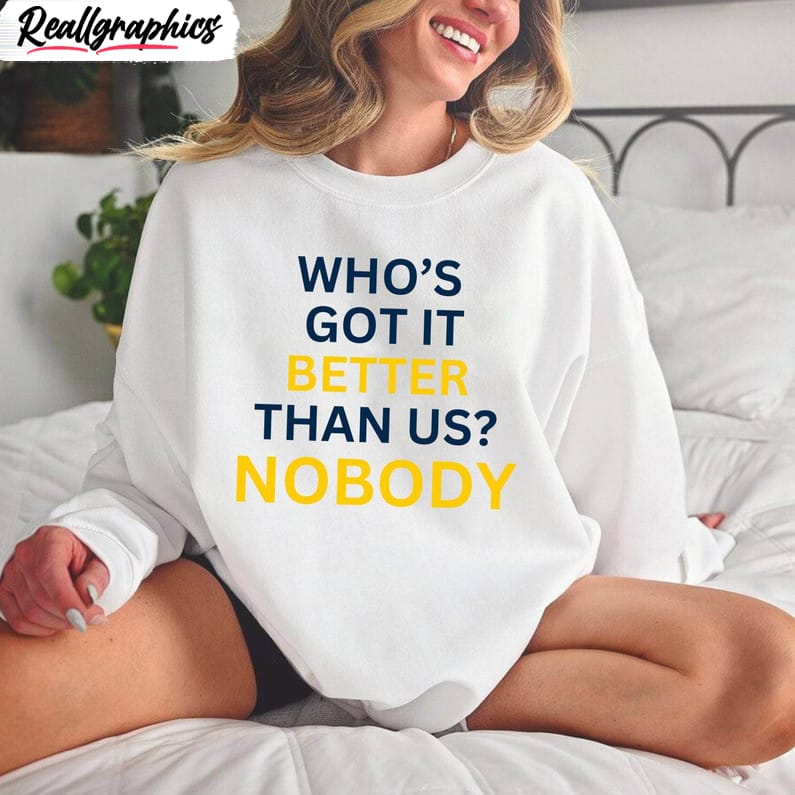 This exquisite piece of clothing perfectly unites both fashion and nostalgia. The limited-edition sweatshirt presents the iconic phrase, Who’s Got It Better Than Us?, invoking a sense of camaraderie among all Michigan fans. Given its unisex design, this versatile piece fits comfortably on anyone, irrespective of their gender. Its carefully crafted hoodie provides additional warmth and a stylish edge, ensuring to meet both your fashionable and practical needs. The vibrant print design elevates it from a simple sweatshirt to an emblem of Michigan pride that every fan should consider adding to their collection.