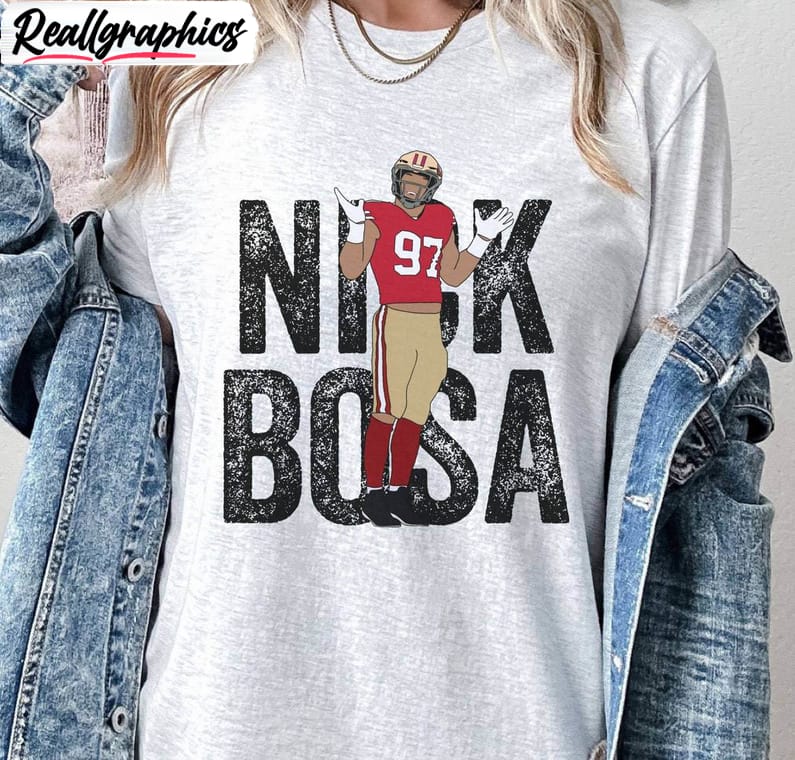 Opt for an awesome addition to your casual wardrobe with this sporty, long-sleeved sweatshirt. It proudly boasts the number 97 and the name Nick Bosa, lending a high-impact sports vibe. Rooting from the beloved San Francisco team, the shirt embodies a perfect fusion of fashion and football. Made with utmost comfort in mind, it ensures a snug fit while providing ample warmth. Whether you’re cheering from the stands, hanging out with friends, or just having a laid-back day at home, this sweatshirt is an ideal choice. Perfect for die-hard supporters, it’s a superb way to show off your love for football and the San Francisco team.