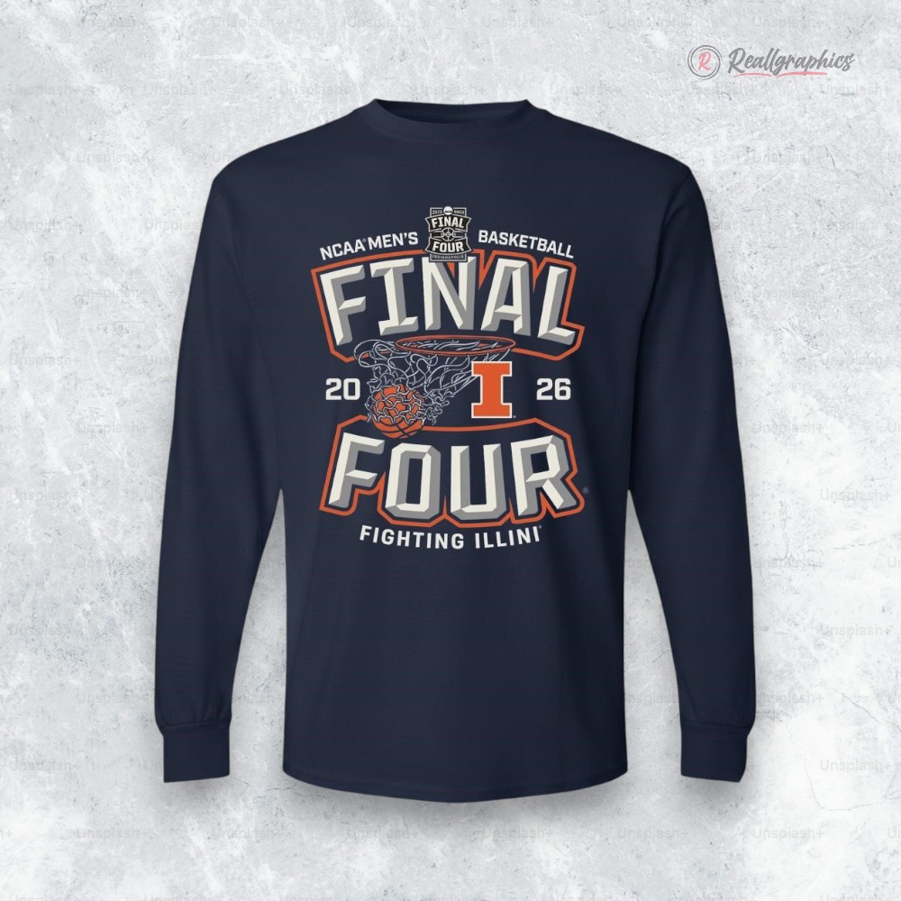 Orange and navy collide in a striking, bold layout that immediately grabs attention. At center stage, a basketball hoop and ball dominate the chest, surrounded by varsity-style block letters declaring the year 2026 and the Final Four insignia. The Illinois “I” emblem anchors the design, tying the excitement firmly to Fighting Illini pride. The typography’s outlined edges give a collegiate toughness, while the clean lines keep it sharp and athletic. Wearing this long sleeve t-shirt says something about passion and dedication—not just to the game, but to a community that rallies under those vibrant team colors every season. It’s the kind of gear that fits easily into a weekend full of watching buzzer-beaters and debating plays with fellow Illinois supporters. Whether layered under a jacket on a crisp spring night or casually tossed on for a game-day gathering, it carries a tone of quiet confidence without screaming for attention. This is a shirt for those who like their sportswear to reflect more than fandom—a personal connection to moments where effort meets celebration. College basketball enthusiasts and die-hard Fighting Illini fans will find it resonates beyond just another piece of apparel. Its presence feels at home in conversations and cheers, the kind that linger long after the final whistle. It’s not just a Final Four basketball shirt; it’s a subtle badge of belonging wrapped in familiar, athletic energy.