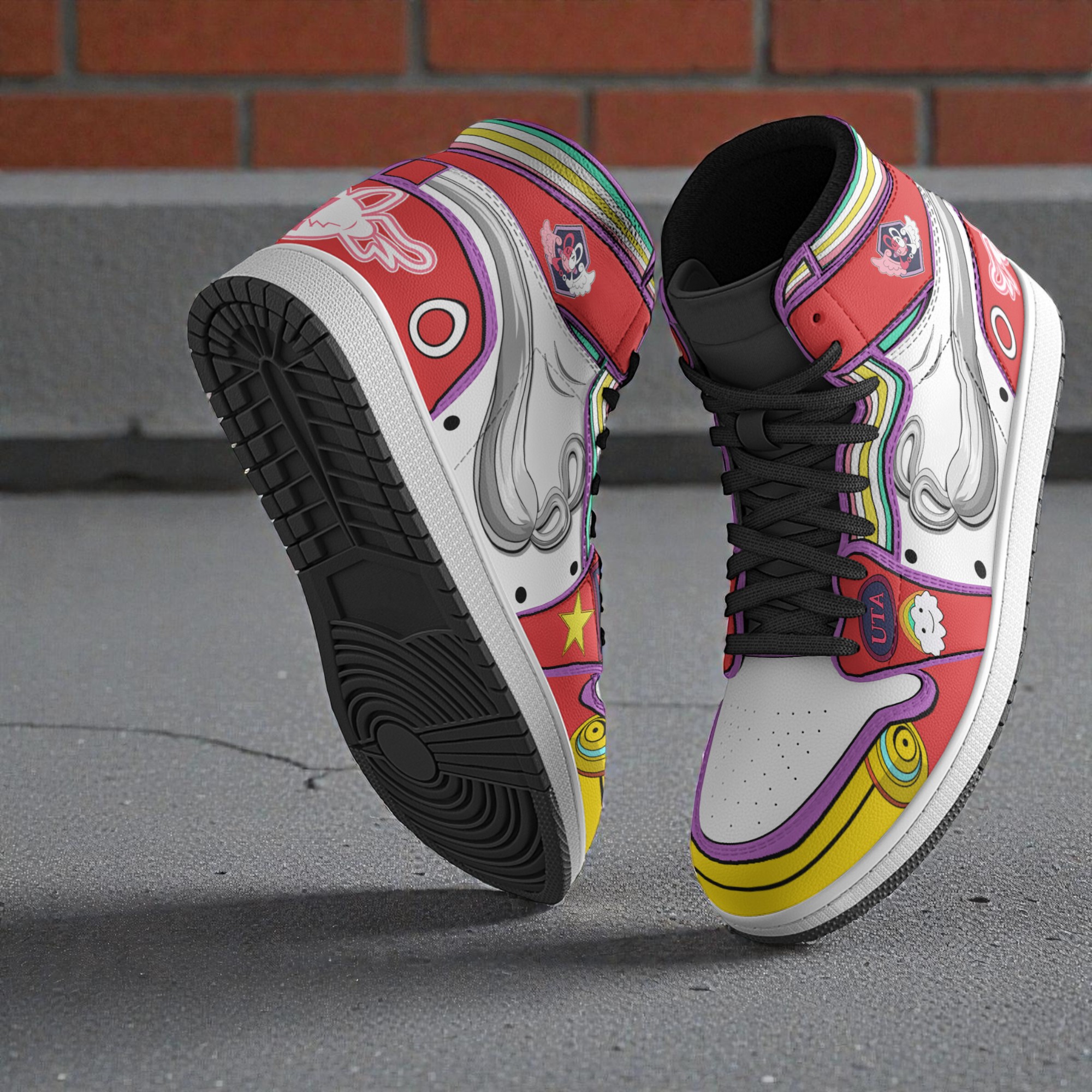 There’s something about the way fans express themselves that goes beyond just watching or playing—it’s about wearing a piece of that world. These Uta One Piece sneakers nail that feeling with their bold, unapologetic style. The design bursts with bright blocks of red and yellow, set against a clean white base that keeps everything popping without feeling overdone. Black laces thread through the shoe, grounding the energy and giving it a bit of edge. Up close, the winged Nike-like swoosh and star motifs add a playful twist, while the character emblem staked on the side pulls the whole anime-inspired graffiti and pop art theme together flawlessly. The lettering? Think bold, blocky, outlined tags that shout “RED” in the kind of cartoonish style that could only come from a true streetwear playground. These sneakers are for the ones who live and breathe anime culture, who want their sneakers to carry the same intensity as their favorite fights or story arcs. Sneakerheads with a soft spot for Japanese animation, gamers scouting for standout gear, or anyone obsessed with a bit of bold rebellion will find themselves drawn to this mashup of character and brand in a way that feels authentic. They aren’t just footwear; they’re a statement. Ideal for conventions, casual hangouts, or the next big sneaker drop, they also make a thoughtful gift for collectors or the fashion-forward friend who’s impossible to shop for. If you’re hunting for Uta One Piece sneakers that go beyond typical fan gear, these are a wild, colorful ride worth taking.Film Red Shoes Custom Uta One Piece Anime Jordan Sneaker Boots