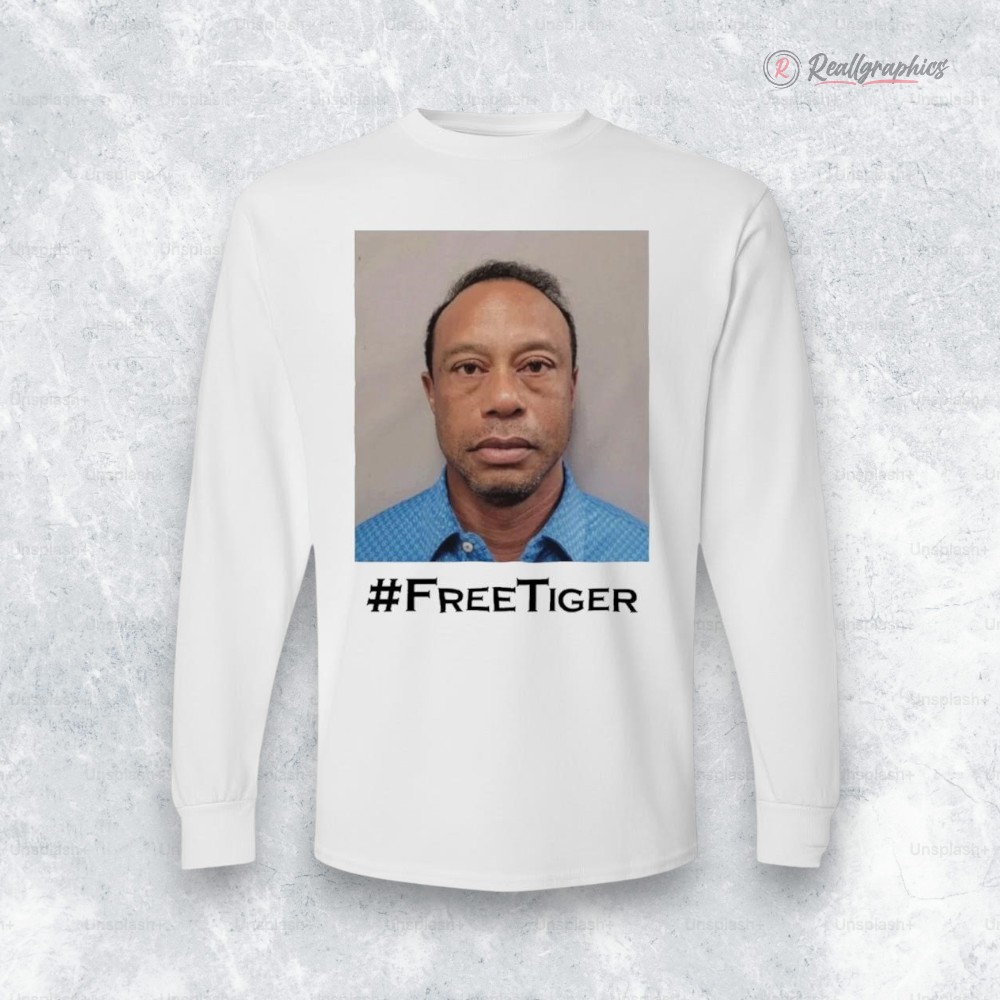 A stark black-and-white mugshot captures attention at the center of a crisp white long-sleeve shirt. The subject’s gaze is direct, unflinching, framed by the clean lines typical of documentary photography. Beneath the portrait, a bold hashtag—#FreeTiger—spreads across the fabric in blocky, all-caps type that demands notice without ornamentation. The font is strong and serif-free, complementing the urban edge of the composition. This design carries an unmistakable attitude, speaking to those who wear their values on their sleeves—literally. It’s a visual statement packed with tension and purpose, where activism meets streetwear. The unembellished white canvas of the shirt contrasts sharply with the intense imagery and lettering, reinforcing the seriousness of the message without veering into cliché. People drawn to social justice issues or advocacy campaigns will recognize the significance behind the image and hashtag. It’s a piece that resonates during protests or rallies, but it also fits naturally into casual settings where self-expression matters. As a gift, it suits someone who approaches freedom and justice not just as abstract ideas, but as urgent causes deserving visible support. Within its simplicity, the free tiger mugshot shirt offers more than style—it offers a symbol of defiance and solidarity, wrapped in the quiet craftsmanship of thoughtful design.