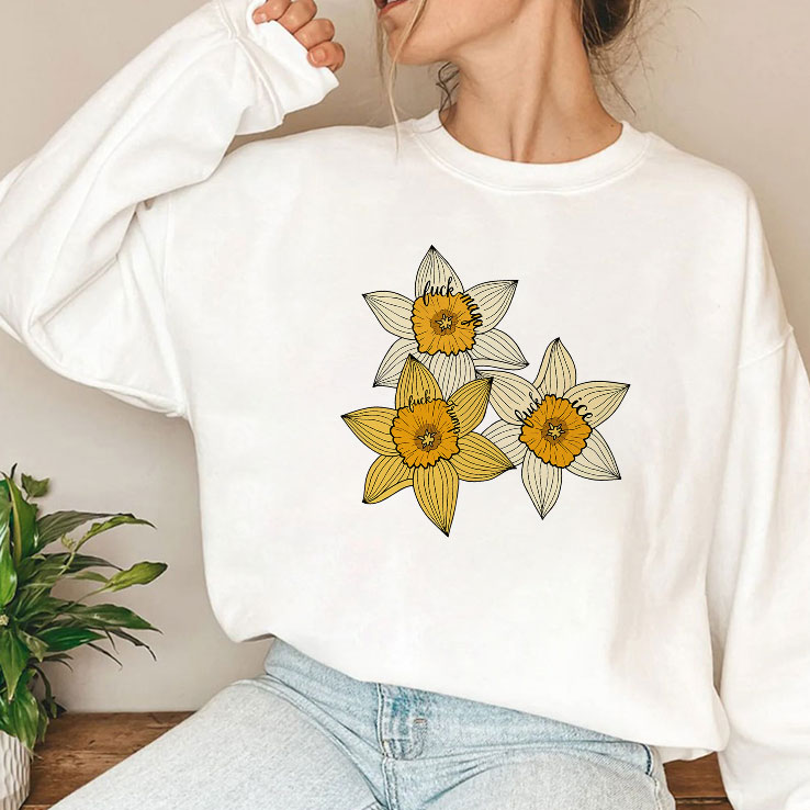Bright yellow daffodils burst from the fabric, their petals sharp and unapologetic against a stark backdrop of bold text. The phrase Fuck MAGA Fuck Trump Fuck ICE cuts through the softness of the floral imagery with deliberate contrast, blending delicacy and defiance into one striking composition. Each flower seems almost hand-painted, the brushstroke details capturing the fragile resilience behind the statement. This shirt isn’t about subtlety; it’s crafted for someone who wears conviction as clearly as they wear their style. The layout places the words prominently, yet the trio of daffodils softens the aggression just enough to invite a second glance. It’s a design that challenges expectations—combining the natural optimism of spring blooms with unfiltered political stance. For anyone whose identity is intertwined with both floral aesthetics and fierce dissent, this shirt serves as a layered expression. It speaks to people who appreciate art that holds up a mirror to the times while refusing to lose its visual grace. Whether layered under a jacket for colder days or paired with jeans on a sunny afternoon, it’s a choice that says something about the wearer’s worldview and what they’re willing to stand for. The craftsmanship here balances eye-catching detail with candid messaging, creating an unmistakable piece that resonates beyond the usual graphic tee. It fits into a lifestyle that’s unafraid to question and confront through personal style.