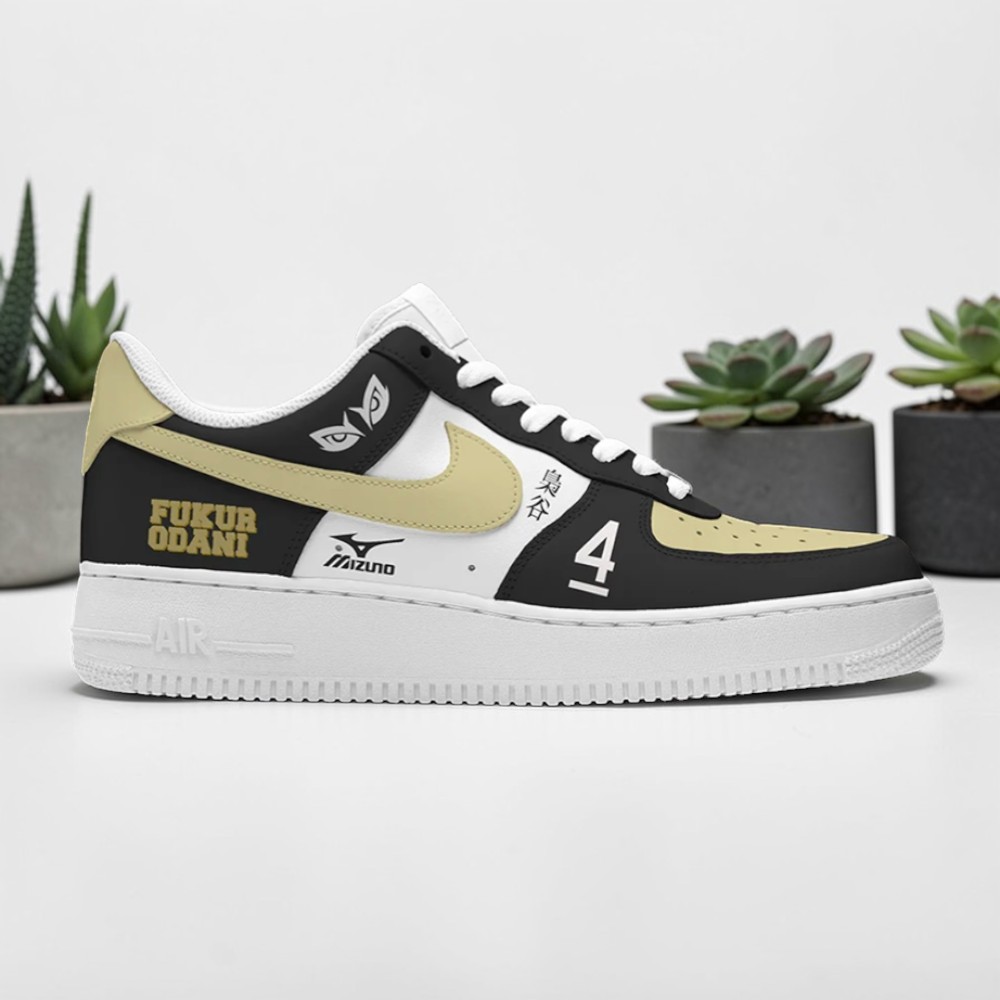 A striking balance of boldness and refinement emerges from the interplay of black, white, and gold on these sneakers. The oversized gold swoosh commands attention, cutting through a base palette that feels both classic and spirited. Across the side, the varsity-style lettering spells out “Fukurodani” with crisp precision, echoing the collegiate energy that pulses through the design. Subtle yet meaningful details like the ninja eye motifs and stylized kanji add a layer of narrative, inviting a closer look and rewarding those familiar with the Haikyuu universe. Each element feels thoughtfully placed, from the number 4 etched with clean sans typography to the Mizuno logo nestled discreetly, grounding the otherwise graphic composition in authentic sports heritage. This visual language captures more than just a team’s style; it channels the fierce competitiveness and playful spirit embedded in Fukurodani Academy’s personality. For the wearer, these shoes become a quiet declaration—an insider’s nod to fellow anime fans and sneaker enthusiasts who appreciate craftsmanship intertwined with cultural storytelling. Worn casually or at fan gatherings, the design carries its energy effortlessly, making it a versatile piece that transcends the court and bleacher seats. Whether layered into streetwear or showcased among a collection, the Fukurodani Haikyuu sneakers stand out as a celebration of identity and passion, skillfully blending athletic aesthetics with anime-inspired vigor.Fukurodani Academy Haikyuu Nike Air Force 1 Sneakers