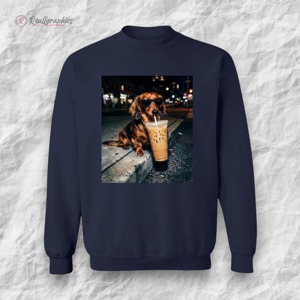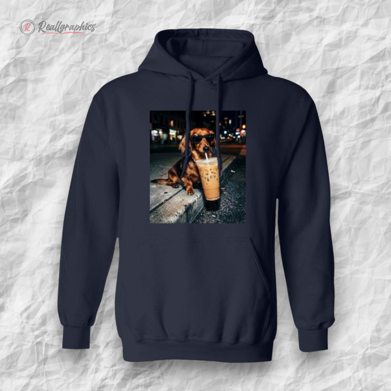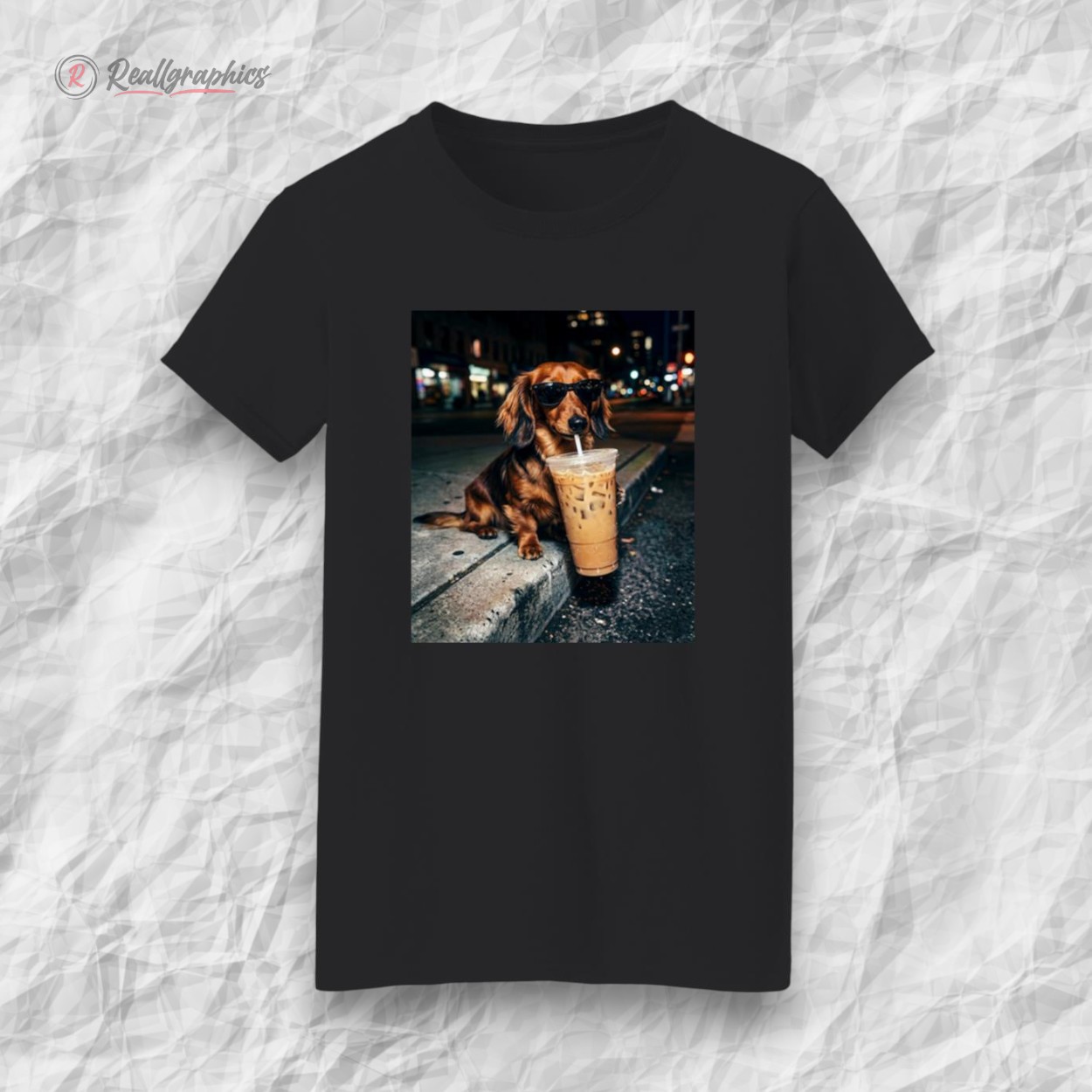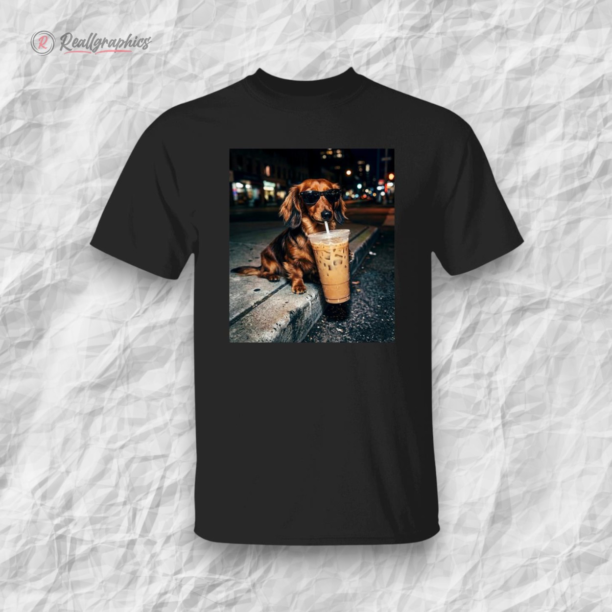 A dachshund casually perched on a city sidewalk, sipping iced coffee under the glow of streetlights — that image alone says enough. This shirt captures that exact moment with a playful twist: the dog’s long, curious snout peeks from a dark hoodie background, holding a chilled mug that seems almost too human for comfort. The night setting adds a cozy, relaxed vibe that feels like a quiet pause amid the urban hustle. It’s not just about the humor of a dog enjoying iced coffee. This design speaks to those who see themselves in little quirks and unexpected pleasures, people who appreciate whimsy without losing their edge. Dog lovers who know the charm of that distinctive dachshund silhouette will get the appeal instantly. It’s an invitation to express personality without saying a word, the kind of piece that feels equally at home at a casual brunch or a low-key weekend stroll. For anyone who lives for comfortable, clever streetwear that’s as much about mood as it is style, this shirt slips quietly into the wearer’s identity. It’s a nod for those who find joy in the everyday and a wink for anyone who treasures the simple connection between canine companions and caffeine breaks. A funny dachshund iced coffee shirt like this adds a bit of character to ordinary days, making it a natural pick for gifting or just owning something genuinely different.Funny Dachshund Drinking Iced Coffee Unisex Shirt