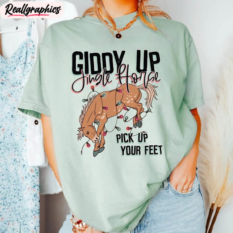 Giddy Up Jingle Horse Pick Up Your Feet Shirt, Christmas Cowgirl Long Sleeve Crewneck Sweatshirt