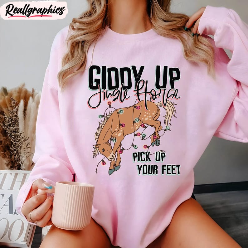 Giddy Up Jingle Horse Pick Up Your Feet Shirt Christmas Cowgirl Long Sleeve Crewneck Sweatshirt details